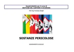 Documento sulle Sostanze Pericolose. Il Pdf, un sussidio didattico per la formazione professionale, tratta le misure di prevenzione e protezione relative alle sostanze pericolose, inclusi i dispositivi di protezione individuale e collettiva, per il corso di Gestione del Cantiere e Sicurezza.