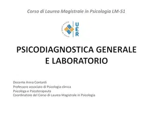 Slide da Uer su Psicodiagnostica Generale e Laboratorio. Il Pdf, utile per studenti universitari di Psicologia, esplora l'uso dei test psicologici, le strategie di somministrazione e l'importanza del colloquio clinico per la formulazione dell'ipotesi diagnostica.