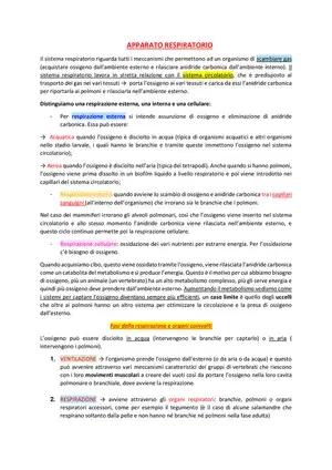 Documento sull'Apparato Respiratorio. Il Pdf di Biologia per l'Università esplora i meccanismi di ventilazione, diffusione e distribuzione dei gas, analizzando le specificità della respirazione negli anfibi e l'importanza della superficie respiratoria.