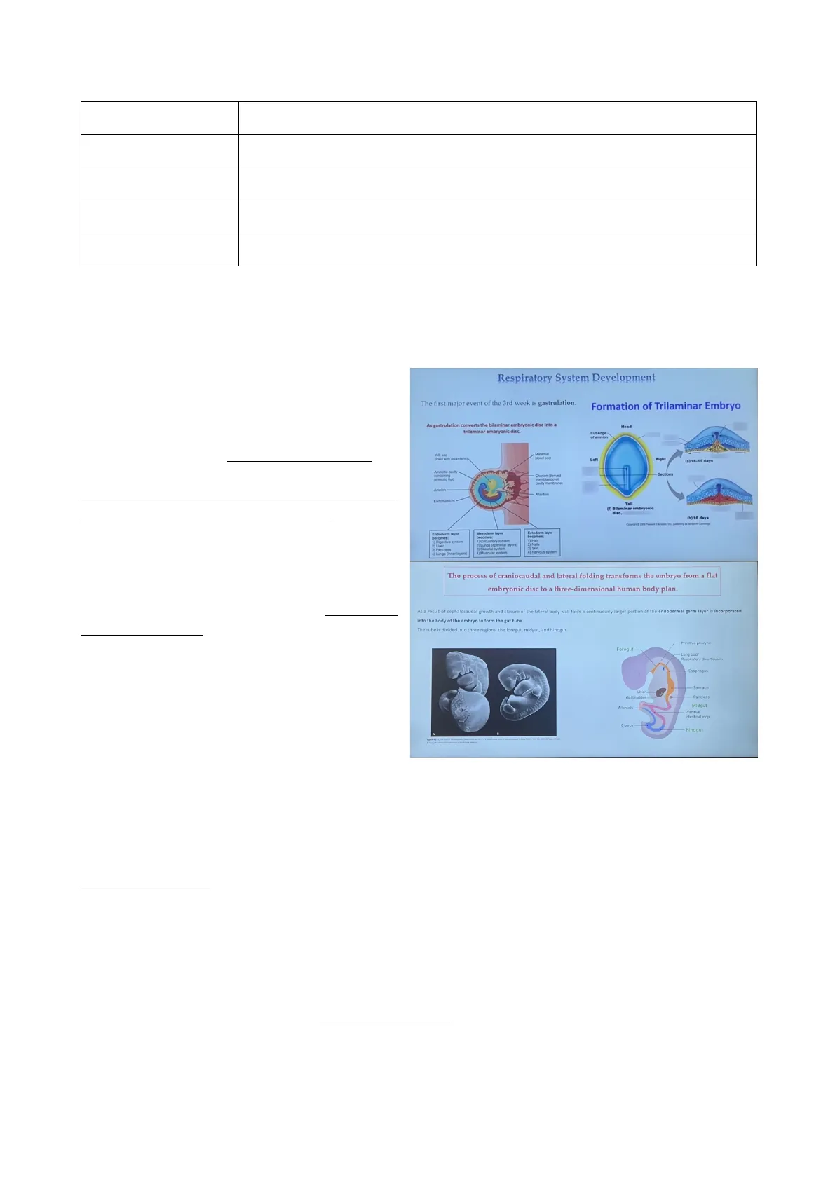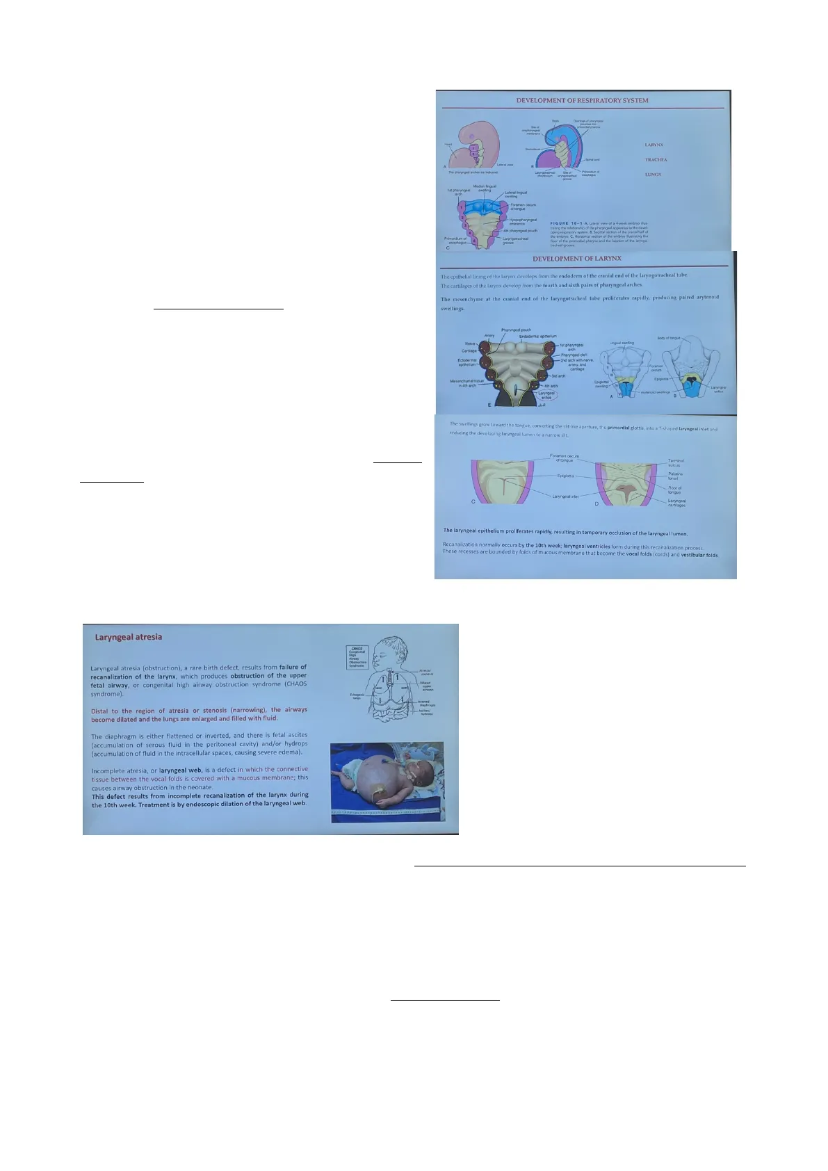 Come conseguenza di questo ripiegamento, l'endoderma verrà internalizzato e formerà il cosiddetto intestino primitivo. L'embrione, che fino ad ora era pressoché piatto, a questo punto è stato trasformato in una struttura tridimensionale. Questa ricapitolazione degli eventi della 3 e 4 settimana è importante ai fini dello studio del sistema respiratorio, poiché per il suo sviluppo è importante proprio l'intestino primitivo, che può essere suddiviso in una regione anteriore, detta intestino anteriore, e in un intestino medio e posteriore. Quello su cui bisogna focalizzarsi è l'intestino anteriore perché è proprio lì che si svilupperà il sistema respiratorio grazie all'interazione dell'endoderma con il mesoderma circostante (nello specifico il mesoderma splancnico). Infatti, nella diapositiva seguente si può notare che zoomando la parte dell'intestino primitivo, esso è caratterizzato dalla presenza di 5 tasche faringee: 1,2,3,4 e 6. La quinta tasca faringea non c'è perché non si forma proprio e se si forma regredisce molto velocemente. Daquesta struttura dell'intestino primitivo si formeranno la laringe, la trachea e i polmoni. In particolare, la laringe si forma come una piccola fessura tra la 4 e la 6 tasca faringea. L'epitelio di rivestimento della laringe, così come tutto il resto del rivestimento epiteliale, deriva proprio dall'endoderma di questa regione, mentre tutti i tessuti di supporto come la cartilagine e il muscolo, derivano dal mesoderma che circonda questa regione. Tra la 4 e la 6 tasca faringea si forma e sviluppa l'orifizio laringeo. Successivamente, grazie alla proliferazione delle cellule del mesoderma si generano due rigonfiamenti: uno da origine all'epiglottide, l'altro (quello inferiore) da origine alla laringe. Le cellule di questo rigonfiamento, in seguito a proliferazione, invadono l'orifizio laringeo (che ha la forma di una piccola fessura a T) andandolo a chiudere. La ricanalizzazione della laringe si verifica alla decima settimana con la formazione delle corde vocali e i ripiegamenti vestibolari. Ricordiamo che la laringe è coinvolta anche nella produzione dei suoni e della parola.