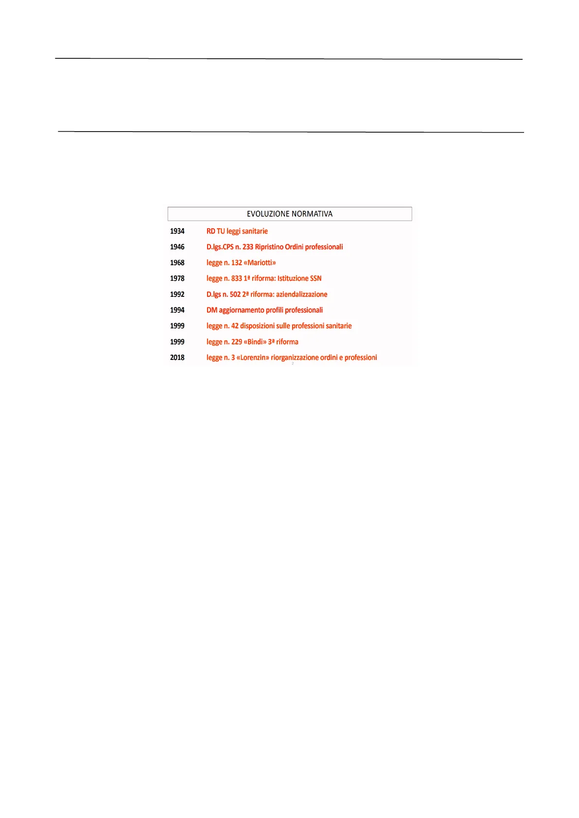 EVOLUZIONE NORMATIVA 1934 RD TU leggi sanitarie 1946 D.lgs.CPS n. 233 Ripristino Ordini professionali 1968 legge n. 132 «Mariotti» 1978 legge n. 833 1ª riforma: Istituzione SSN 1992 D.lgs n. 502 2ª riforma: aziendalizzazione 1994 DM aggiornamento profili professionali 1999 legge n. 42 disposizioni sulle professioni sanitarie 1999 legge n. 229 «Bindi» 3ª riforma 2018 legge n. 3 «Lorenzin» riorganizzazione ordini e professioni