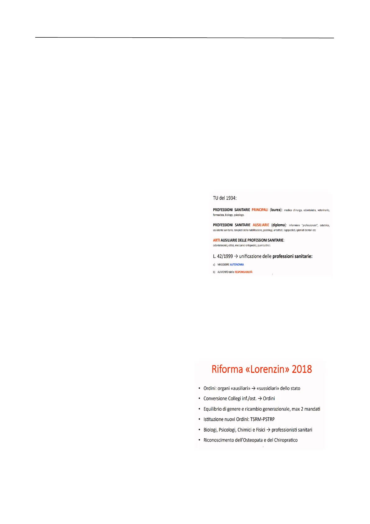 Riforma «Lorenzin» 2018 · Ordini: organi «ausiliari»> > «sussidiari» dello stato · Conversione Collegi inf./ost. - > Ordini · Equilibrio di genere e ricambio generazionale, max 2 mandati · Biologi, Psicologi, Chimici e Fisici -> professionisti sanitari · Riconoscimento dell'Osteopata e del Chiropratico