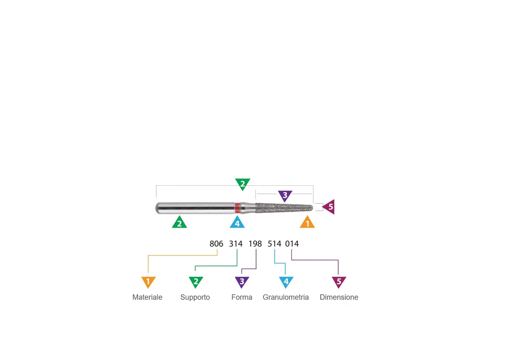 2 3 5 2 4 1 806 314 198 514 014 1 2 3 4 5 Materiale Supporto Forma Granulometria Dimensione· Un buon modo per capire tutto ciò che riguarda le frese dentali è pensare ai 5 punti che la classificazione ISO considera su di esse: