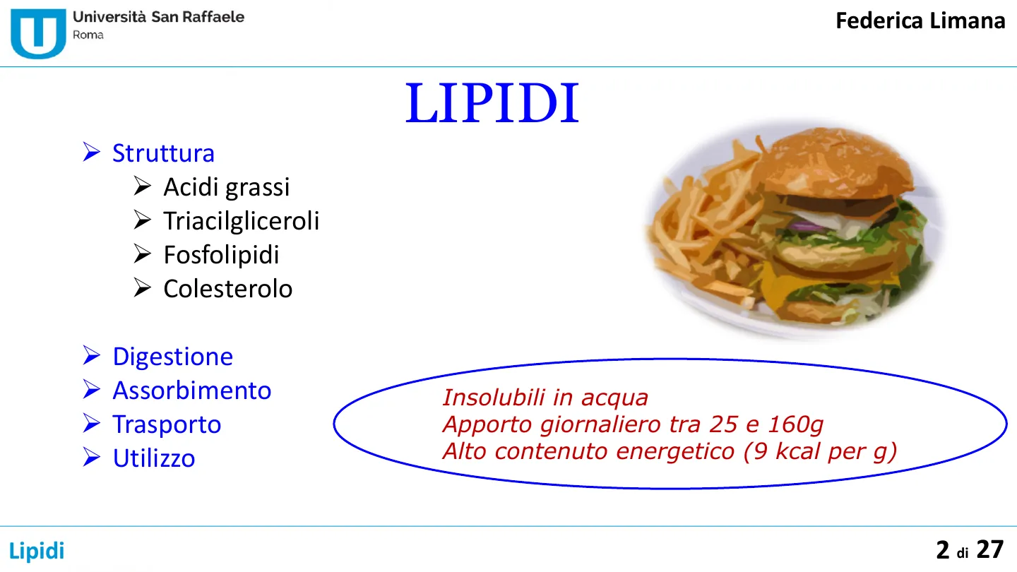 Slide dall'Università San Raffaele Roma sui lipidi. Il Pdf esplora la struttura, le funzioni e il metabolismo dei lipidi, inclusi triacilgliceroli, fosfolipidi e colesterolo. La presentazione, utile per lo studio universitario di Biologia, illustra l'importanza dei lipidi come riserva energetica e componenti delle membrane cellulari.