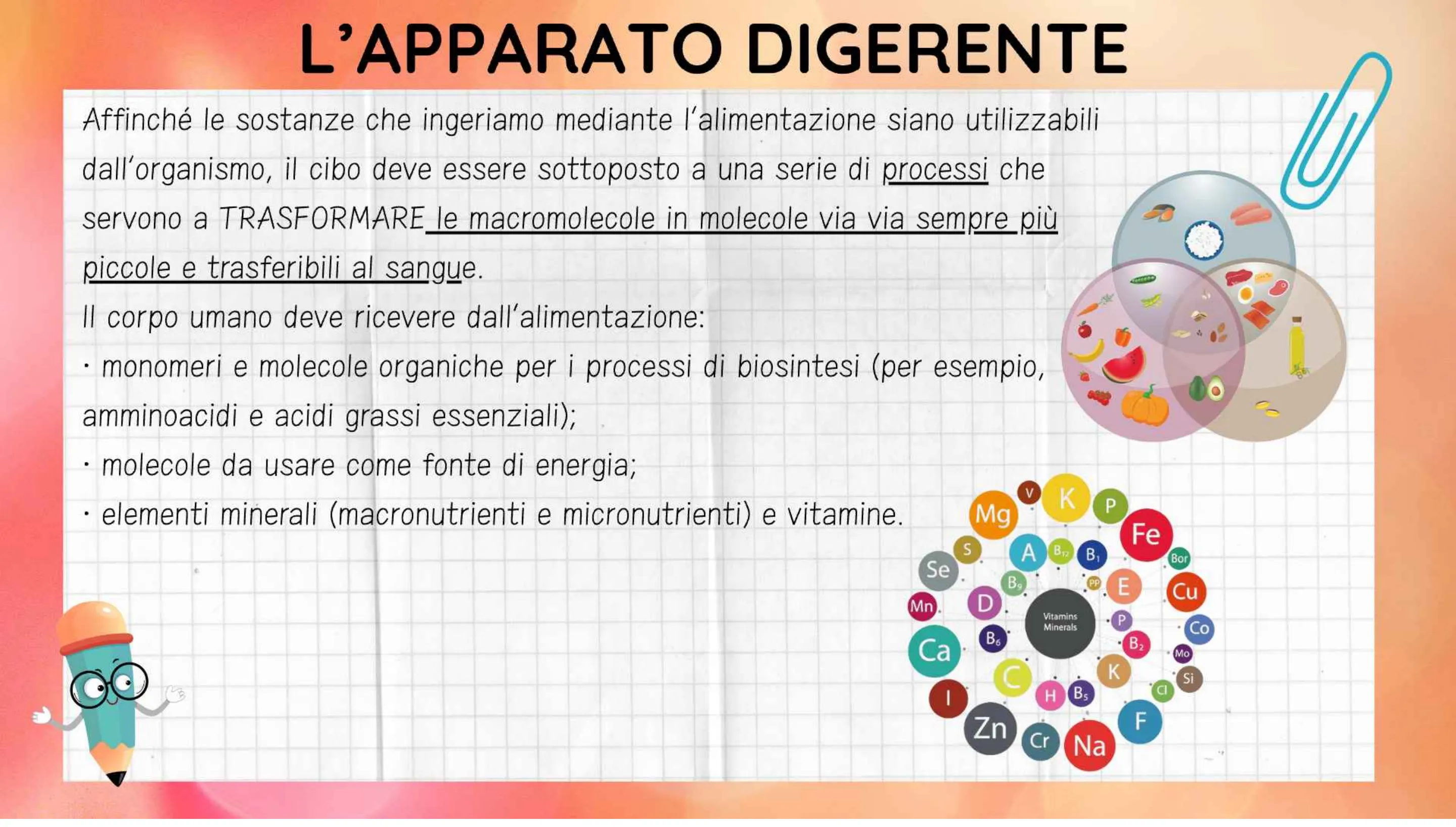 V K P Mg Fe S A B Bor Se B9 PP E Cu Mn Vitamins Minerals P Co B6 B2 Mo C K Si I H Bs Zn F Cr Na D . CaL'APPARATO DIGERENTE