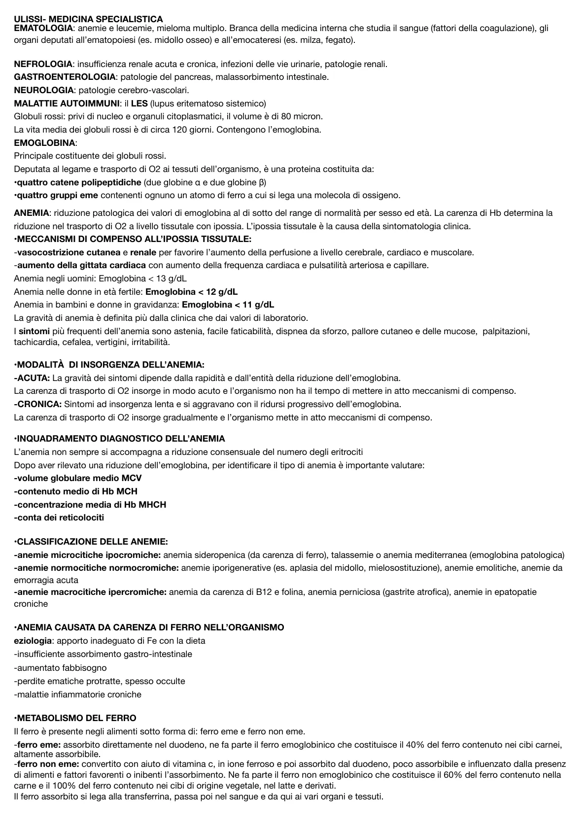 Documento di Università su Ulissi Medicina Specialistica. Il Pdf, utile per lo studio universitario di Biologia, offre un compendio dettagliato di ematologia, coprendo anemie e leucemie con eziologia, patogenesi, sintomi, diagnosi e trattamenti.