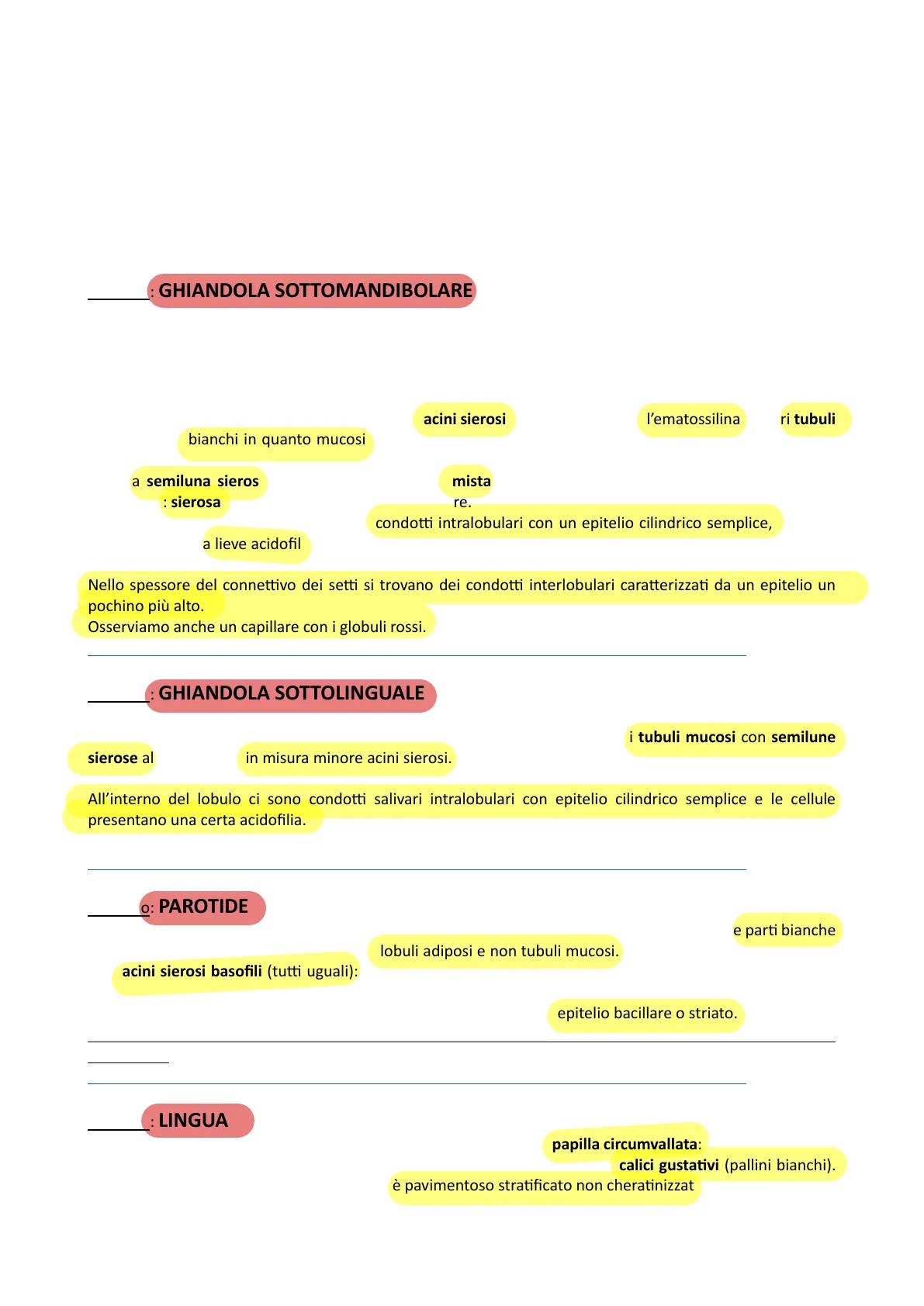 Verrà presentano prima a un ingrandimento minore, che lo fa vedere nell'insieme: in questo modo notiamo che è un organo pieno, che ha una capsula da cui partono dei setti molto evidenti che si approfondano nel parenchima e lo dividono in lobuli. Dopodiché si ingrandisce, andando a vedere nell'ambito dei vari lobuli per vedere se il parenchima è omogeneo o meno: in questo caso si vedono sia acini sierosi che si colorano con l'ematossilina e i vari tubuli che appaiono bianchi in quanto mucosi (non proprio bianchi comunque chiari, attenzione completamente bianco è il lobulo adiposo) con la colorazione con ematossilina-eosina e alla periferia del tubulo mucoso si vede la semiluna sierosa. È quindi una ghiandola mista ma questo punto dobbiamo decidere qual è la prevalenza: sierosa quindi ghiandola sottomandibolare. A livello dei lobuli possiamo descrivere i condotti intralobulari con un epitelio cilindrico semplice, notiamo anche che c'è una lieve acidofila, infatti, i condotti salivari sono ricchi mitocondri nel labirinto basale. Di solito lungo i setti si trovano i lobuli adiposi. Nello spessore del connettivo dei setti si trovano dei condotti interlobulari caratterizzati da un epitelio un pochino più alto. Osserviamo anche un capillare con i globuli rossi. histologyslides.med.umich.edu/Histology/Digestive System/Oral Region/183-1 HISTO 40X.htm