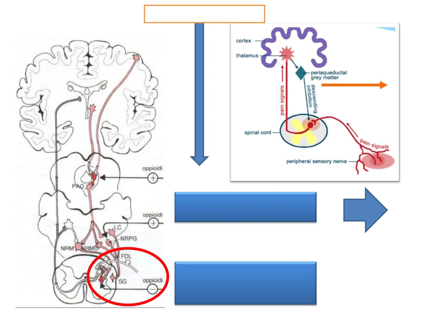 oppioidi + PAG oppioidi LC NRPG NRM NRMC FDL SG oppioidi cortex thalamus 3 periaqueductal grey matter pain signals inhibition descending spinal cord pain signals peripheral sensory nerve Potenziano le vie discendenti/efferenti antinocicettive 1 Le quali inibiscono le vie ascendenti/afferenti nocicettive (es. nelle corna dorsali)SISTEMA OPPIOIDE ENDOGENO