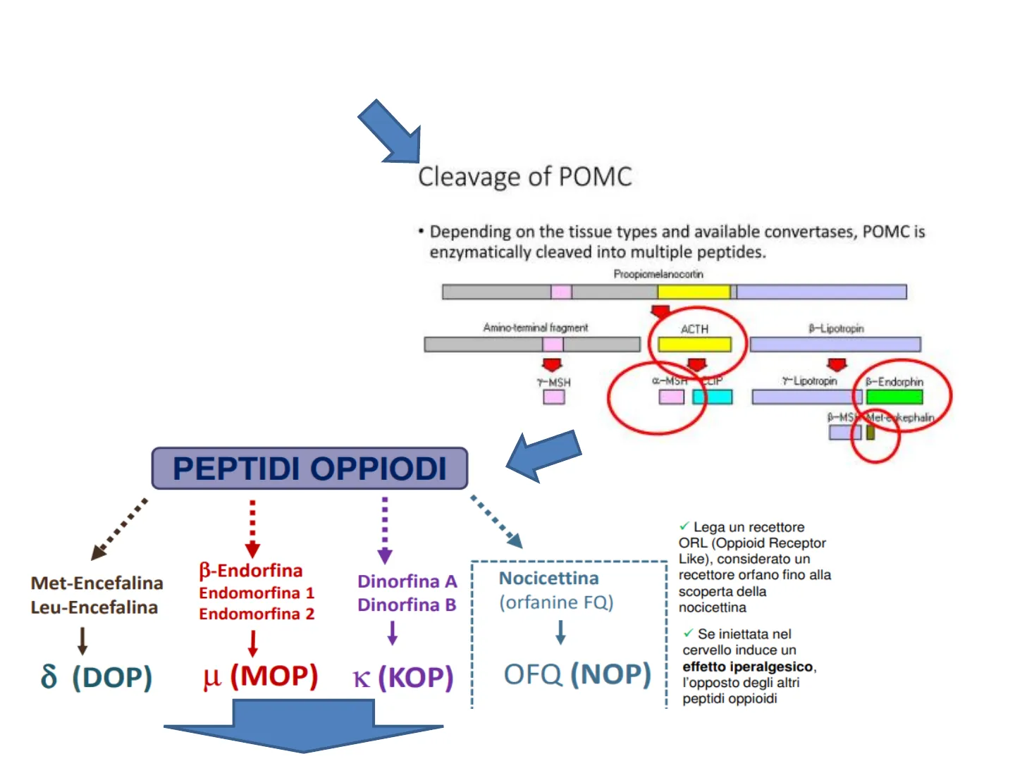 Met-Encefalina Leu-Encefalina ß-Endorfina Endomorfina 1 Endomorfina 2 Dinorfina A Dinorfina B Nocicettina (orfanine FQ) 8 (DOP) μ (ΜΟΡ) K (KOP) OFQ (NOP) v Lega un recettore ORL (Oppioid Receptor Like), considerato un recettore orfano fino alla scoperta della nocicettina 1 v Se iniettata nel cervello induce un effetto iperalgesico, l'opposto degli altri peptidi oppioidiRECETTORI ACCOPPIATI A PROTEINE G