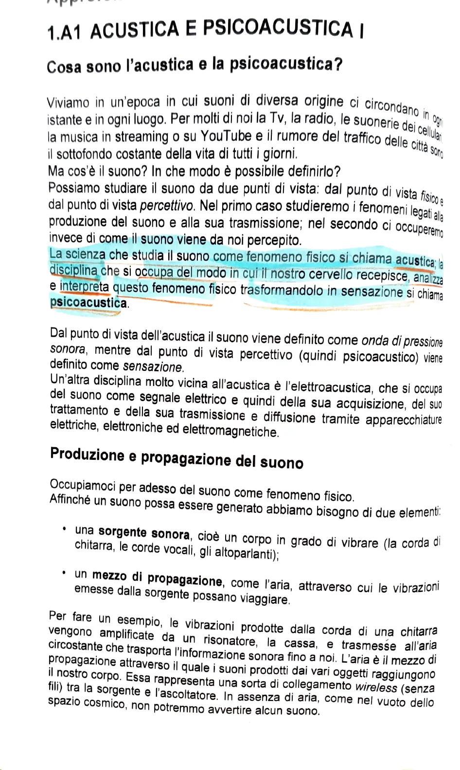 Documento di Università su Acustica e Psicoacustica I. Il Pdf, un approfondimento di Fisica, introduce i concetti di acustica e psicoacustica, spiegando la produzione e propagazione del suono, le caratteristiche delle onde sonore e il concetto di altezza (pitch).