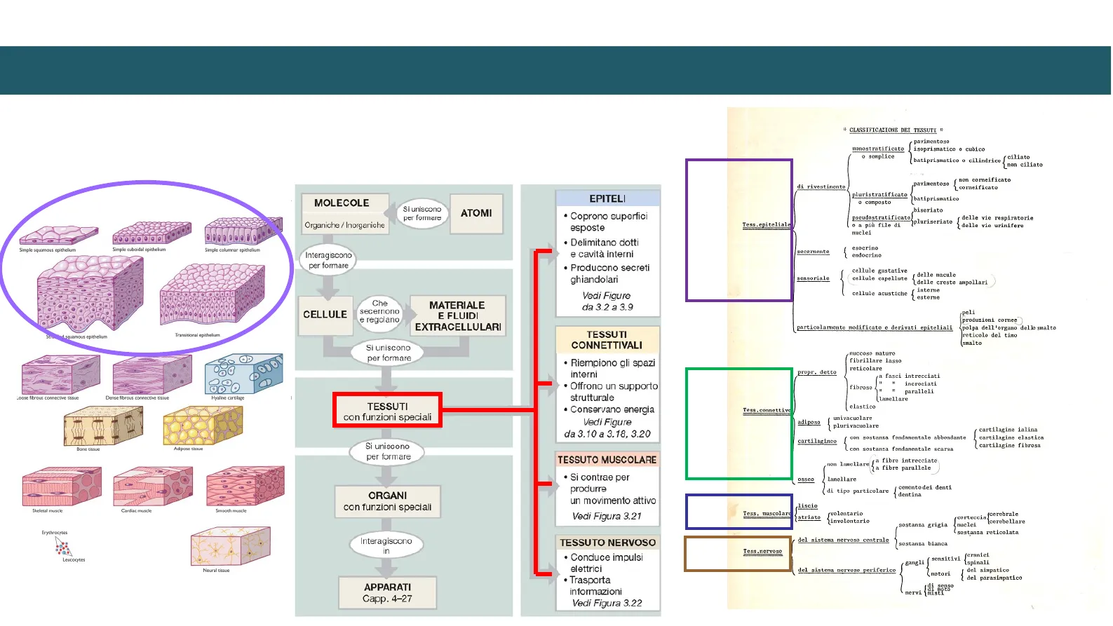 Simple squamous epithelium Simple cuboidal epithelium Simple columnar epithelium Interagiscono per formare · Producono secreti ghiandolari Vedi Figure da 3.2 a 3.9 CELLULE Che secernono e regolano MATERIALE E FLUIDI EXTRACELLULARI Sta A squamous epithelium Transitional epithelium
