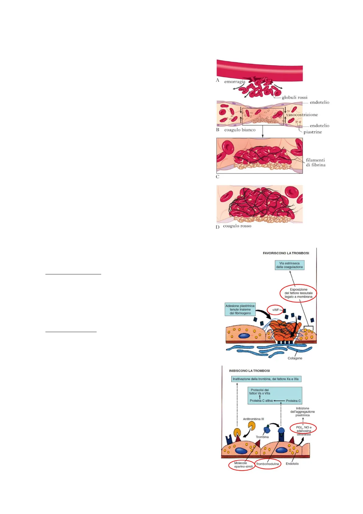 2tagliano i fattori della coagulazione Va e VIIIa (cofattori della cascata coagulativa). Sulle pareti dei vasi ci sono anche delle molecole eparino-simili. L'eparina è un antitrombotico/anticoagulante che lega e aumenta di mille volte l'attività dell'antitrombina, che è il principale anticoagulante fisiologico. In particolare, l'antitrombina agisce tagliando il fattore X e il fattore II (o trombina), ossia i principali fattori della via comune della coagulazione. Quindi l'azione dell'eparina è di aumentare l'attività anticoagulante dell'antitrombina. Le molecole eparino-simili presenti sulla parete vascolare amplificano l'attività anticoagulante dell'antitrombina III. Riassunto della fase vascolare: quando l'endotelio (che normalmente mantiene la fluidità del sangue favorendo l'attività anticoagulante grazie alla presenza delle molecole eparino-simili) viene tagliato/lesionato, si ha vasocostrizione momentanea per marginare la fuoriuscita di sangue accumulando piastrine e fattori della coagulazione nel sito di danno. Vengono inoltre rilasciati fattori come il fattore di Von Willebrand e il fattore tissutale che sono fondamentali per l'avvio della cascata coagulativa.