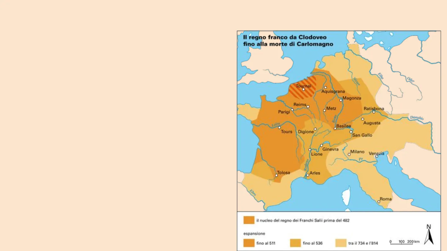 Slide sui Franchi che esplora la loro origine germanica e l'insediamento in Gallia. Il Pdf, utile per la scuola media, tratta il regno di Clodoveo, la sua conversione al cattolicesimo e l'alleanza con la Chiesa, fino alla rinascita carolingia sotto Carlo Magno e la fondazione della Scuola Palatina.
