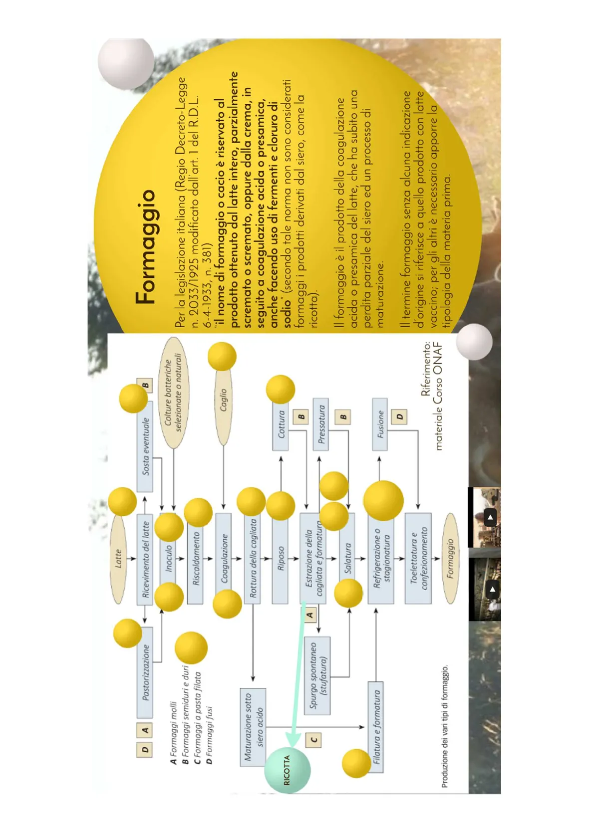 Schemi da Onaf su Formaggio. Il Riassunti descrive il processo di produzione del formaggio, dalla ricezione del latte alla stagionatura, con dettagli sulle variazioni per diversi tipi. Questo materiale di Formazione professionale include una definizione legale e una classificazione basata sulla cottura della cagliata.