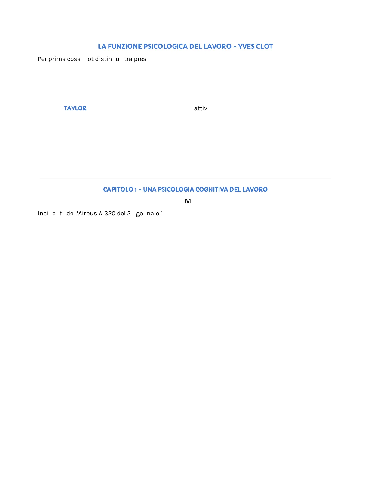 Documento da Università su La Funzione Psicologica del Lavoro - Yves Clot. Il Pdf analizza le teorie di Clot sulla psicologia cognitiva e l'analisi psicologica del lavoro, esplorando emozioni, inibizioni e intenzioni nel contesto lavorativo, con un focus sull'incidente dell'Airbus A-320.