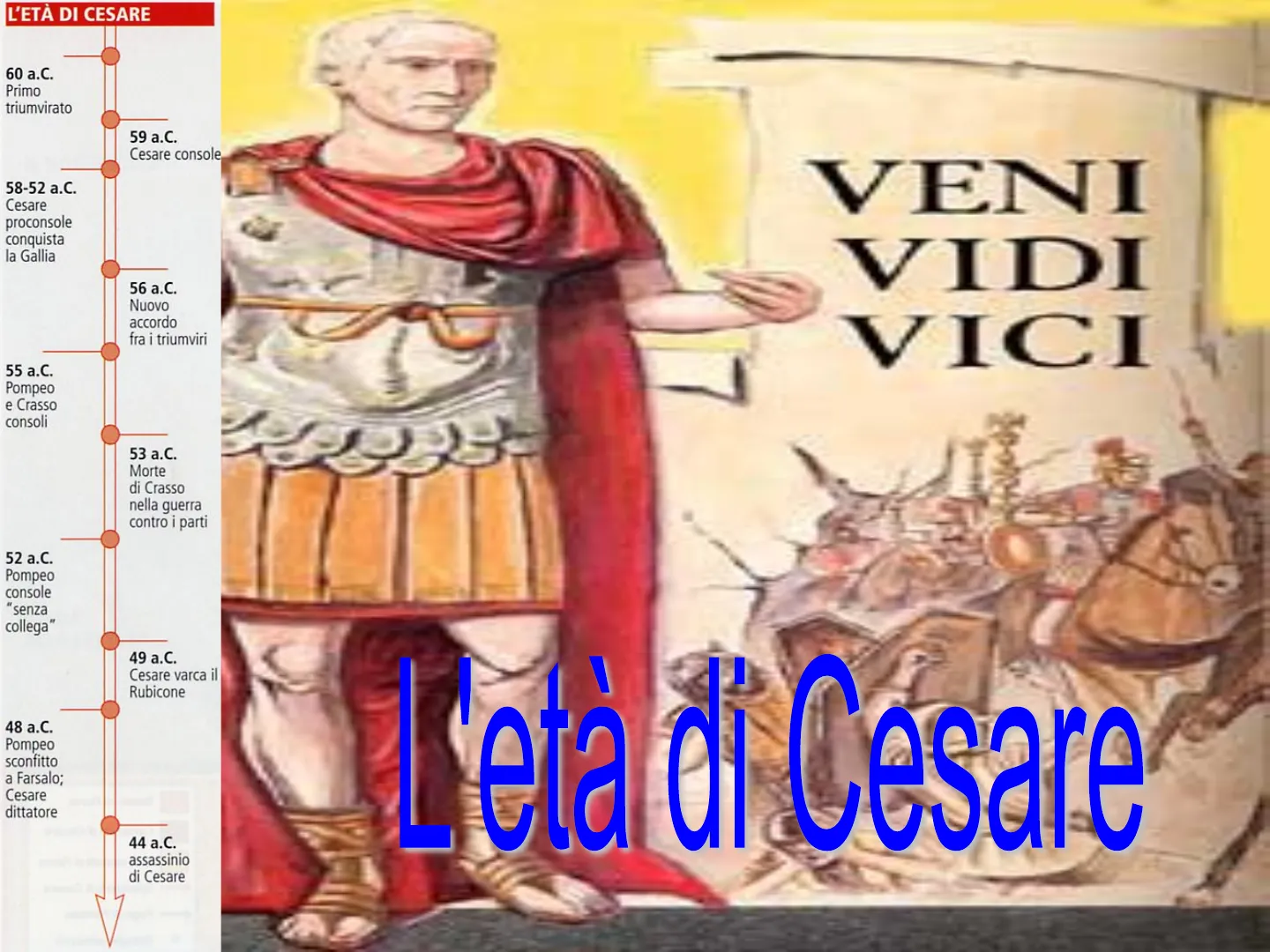 60 a.C. Primo triumvirato 59 a.C. Cesare console 58-52 a.C. Cesare proconsole conquista la Gallia 56 a.C. Nuovo accordo fra i triumviri 55 a.C. Pompeo e Crasso consoli 53 a.C. Morte di Crasso nella guerra contro i parti 52 a.C. Pompeo console "senza collega" 49 a.C. Cesare varca il Rubicone 48 a.C. Pompeo sconfitto a Farsalo; Cesare dittatore 44 a.C. assassinio di Cesare
