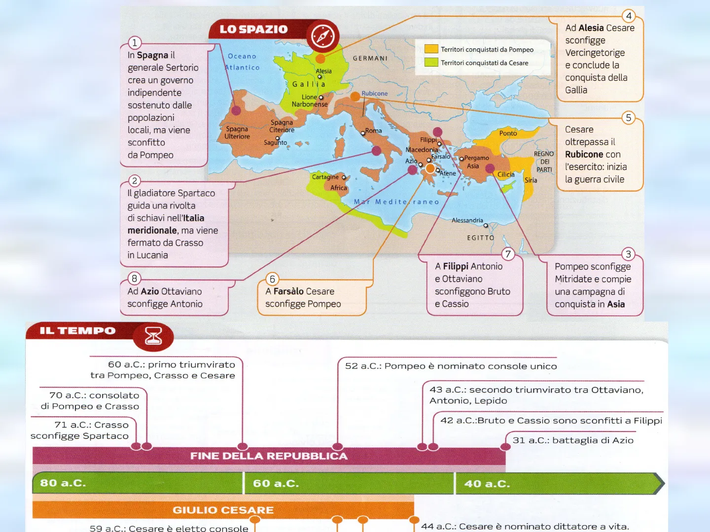 Oceano GERMANI Territori conquistati da Cesare Atlantico Alesia O Gallia Rubicone Lione O Narbonense 5 Spagna Citeriore Roma Ponto Filippi Macedonia Farsalo Pergamo Azio Asia Atene Cilicia Siria Africa Mar Mediterraneo Alessandria EGITTO 7 3 8 6 Ad Azio Ottaviano sconfigge Antonio A Farsàlo Cesare sconfigge Pompeo A Filippi Antonio e Ottaviano sconfiggono Bruto e Cassio Pompeo sconfigge Mitridate e compie una campagna di conquista in Asia
