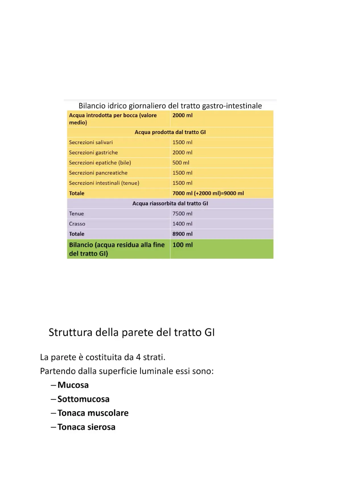 Tratto GI contribuisce al bilancio idro-salino. Beviamo circa 2L di acqua, un po' di acqua la introduciamo con la dieta. Si ha una perdita di acqua con le feci di circa 100mL, e una grande quantità di liquidi secreti e riassorbiti, che arrivano a circa 7L. Quindi il riassorbimento deve essere circa di 9L.