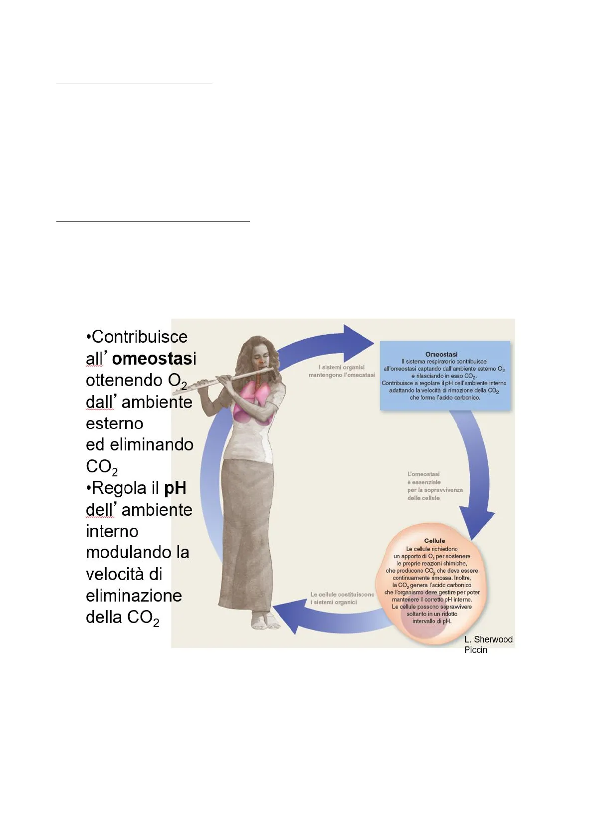 .Contribuisce all' omeostasi ottenendo O2 dall' ambiente esterno ed eliminando CO2 I sistemi organici mantengono l'omeostasi Omeostasi Il sistema respiratorio contribuisce all'omeostasi captando dall'ambiente esterno O2 e rilasciando in esso CO2. Contribuisce a regolare il pH dell'ambiente interno adattando la velocità di rimozione della CO2 che forma l'acido carbonico. L'omeostasi è essenziale per la sopravvivenza delle cellule ·Regola il pH dell' ambiente interno modulando la velocità di eliminazione della CO2 Cellule Le cellule costituiscono i sistemi organici Le cellule richiedono un apporto di O2 per sostenere le proprie reazioni chimiche, che producono CO2 che deve essere continuamente rimossa. Inoltre, la CO2 genera l'acido carbonico che l'organismo deve gestire per poter mantenere il corretto pH interno. Le cellule possono sopravvivere soltanto in un ridotto intervallo di pH. L. Sherwood PiccinRespirazione cellulare (o interna): è l'insieme di processi per i quali, grazie alla presenza d'ossigeno, si ottiene energia in una cellula. L'ossigeno presente nel nostro plasma passa nell'interstizio e di conseguenza avviene lo scambio tra le cellule, quindi-> > l'interstizio è il liquido che circonda tutte le cellule (al di fuori di quelle del sangue), > il plasma è il liquido presente nei vasi sanguigni.