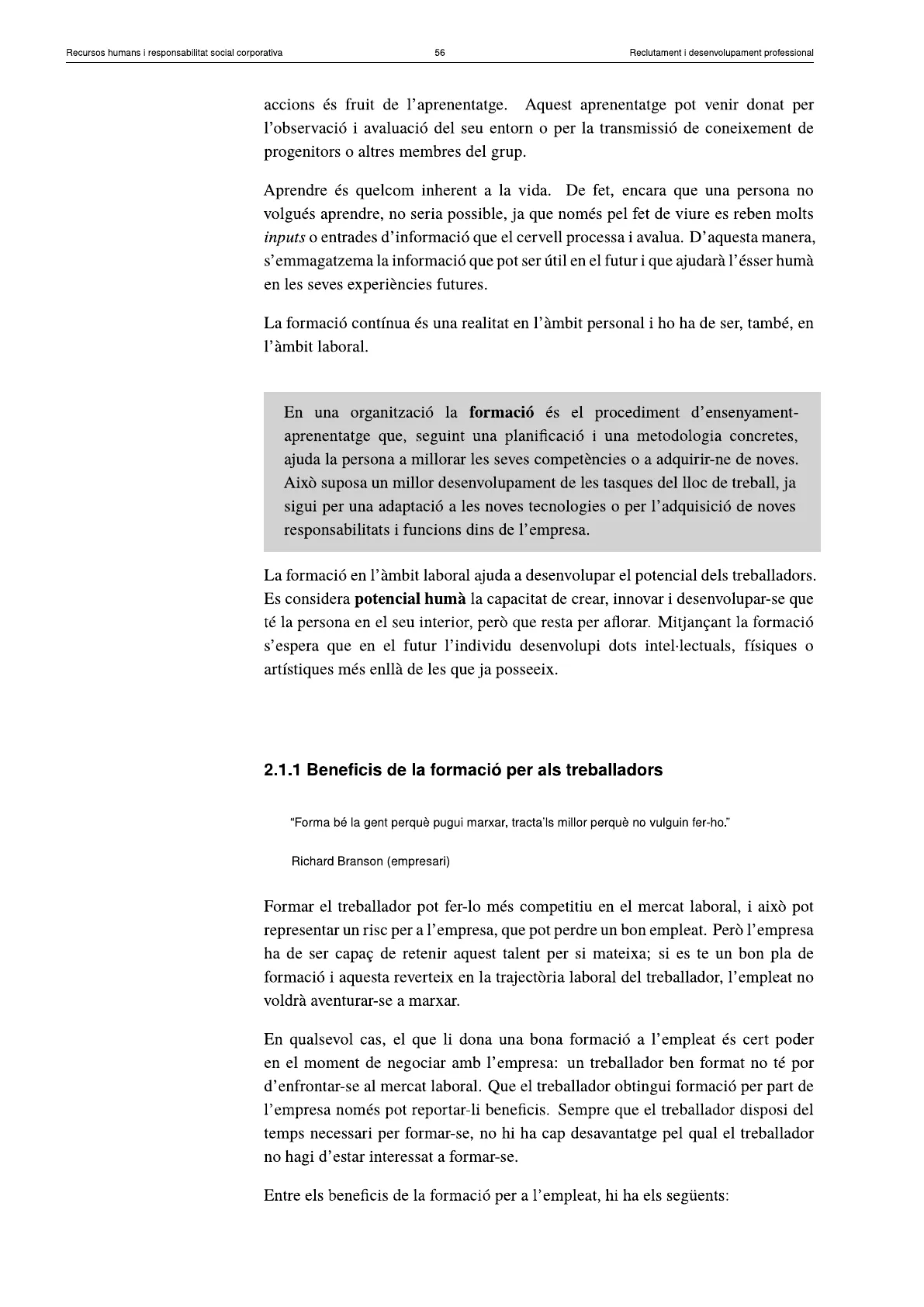 Entre els beneficis de la formació per a l'empleat, hi ha els següents:Reclutament i desenvolupament professional 57 Recursos humans i responsabilitat social corporativa