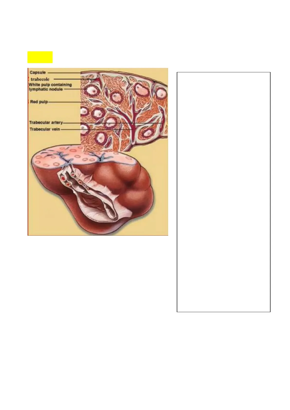 LEZIONE 7 MILZA Capsule trabecole White pulp containing lymphatic nodule Red pulp Trabecular artery Trabecular vein La milza è un organo pieno. Se esaminiamo il suo parenchima vediamo che è organizzato in due aree: la polpa bianca e la polpa rossa. La polpa bianca è data da delle formazioni circolari chiamati corpuscoli di Malpighi cioè noduli linfatici(di tessuto linfoide) che si porta ad avvolgere un tratto di un vaso arterioso. Essa rappresenta la porzione minore di tutto il parenchima splenico e ha funzioni immunitarie. Tutto il resto del parenchima è la polpa rossa che è formata dai cordoni splenici del Billroth(cordoni cellulari, dati da cellule ematiche) e dai seni venosi. All'interno della polpa rossa si esplicano le altre due funzioni della milza che sono quelle di deposito del sangue e quella emocateretica cioè la distruzione dei globuli rossi invecchiati o danneggiati.MILZA