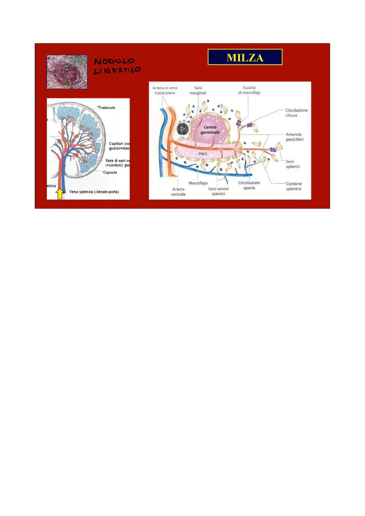 La vascolarizzazione della milza oltre a rappresentare una vascolarizzazione di tipo trofico cioè di apporto di nutrimento all'organo, rappresenta anche una circolazione funzionale perché all'interno della milza si esplica questa funzione emocateretica. L'ilo della milza, che si trova nell'area gastrica in posizione posteriore, quasi a confine con l'area renale. All'ilo della milza arriverà l'area splenica che andrà a vascolarizzare l'organo, quindi esce la vena splenica cioè quella che raccoglie tutto il sangue venoso refluo che è circolato all'interno della milza, e poi troveremo anche i vasi linfatici e tutto quello che possiamo trovare all'interno dell'ilo di quasi tutti gli organi. L'arteria splenica, che è un grosso vaso che origina indirettamente dall'aorta addominale e raggiunge l'ilo della milza. L'arteria splenica arriva all'ilo della milza ed entra all'interno dell'organo e comincia a dividersi in rami. I primi rami di divisione percorreranno delle trabecole all'interno della milza, (che sono dipendenze della capsula che entrano all'interno del parenchima splenico) e prenderanno il nome di arterie trabecolari. Quando l'arteria trabecolare abbandona la trabecola cioè che man mano che questa arteria trabecolare entra all'interno del parenchima emetterà altri rami. Quindi i rami di divisione lasceranno le trabecole entreranno all'interno del parenchima e appena lascia la trabecola viene subito avvolto dal manicotto di tessuto linfoide (nella slide indicato con PALS) prende il nome di arteria centrale, tutto questo va a costituire quei noduli linfatici o corpuscoli del Malpighi e quindi costituiscono la polpa bianca. A livello di queste pals troveremo i linfociti T, linfociti B, macrofagi quindi le cellule della immunocompetenza che nel caso in cui vengono a contatto con sostanze che le attivano, danno vita a quello che è il centro germinativo, quindi vanno incontro a un'intensa proliferazione e si ha il nodulo linfatico attivato che presenta il centro germinativo. A un certo punto l'arteria centrale sarà abbandonato da questo manicotto di tessuto linfoide e emetterà rami sempre più piccoli che prenderanno il nome di arteriole penicillari. Queste poi continueranno a dividersi dando vita ai capillari con guscio. I capillaricon guscio sono chiamati così perché presentano una sorta di manicotto di guaina data da elementi macrofagici e sono presenti anche dei pericidi che sembrerebbero avere una funzione contrattile che quindi avvolgono come un manicotto questi capillari. Ora siamo arrivati alla fase ultima dell'arteria splenica che è entrata all'interno della milza, i capillari con guscio adesso dovrebbero continuare con la componente venosa perché a questo punto il sangue povero di ossigeno dovrebbe fuoriuscire di nuovo dalla milza. I capillari con guscio continuano con la componente venosa che è rappresentata dai cosiddetti seni splenici che rappresentano la componente venosa. Poi questi seni splenici dovrebbero confluire l'uno nell'altro per dar vita a vasi venosi di maggiore dimensioni fino ad avere la vena splenica che fuoriesce dalla milza a livello dell'ilo.
