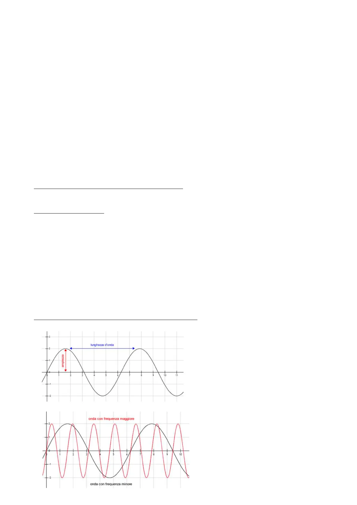 lunghezza d'onda ampiezza 8 10 onda con frequenza maggiore 9 onda con frequenza minore Le onde vengono caratterizzate attraverso l'ampiezza, la lunghezza d'onda che è la distanza tra due teste, la frequenza ovvero le oscillazioni in un secondo, il periodo ovvero l'intervallo di tempo necessario affinché l'onda completi il proprio percorso e la velocità di propagazione, che è la velocità di spostamento dell'onda nella direzione di propagazione (lunghezza d'onda/periodo e si misura in m/s). Le onde elettromagnetiche vengono classificate partendo dalle onde radio, arrivando fino ai raggi x. Lo spettro èmolto ampio e solo un piccolo intervallo può essere percepito ad occhio nudo.