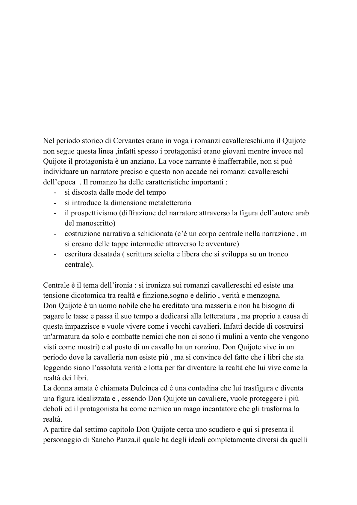 Nel periodo storico di Cervantes erano in voga i romanzi cavallereschi,ma il Quijote non segue questa linea ,infatti spesso i protagonisti erano giovani mentre invece nel Quijote il protagonista è un anziano. La voce narrante è inafferrabile, non si può individuare un narratore preciso e questo non accade nei romanzi cavallereschi dell'epoca . Il romanzo ha delle caratteristiche importanti :