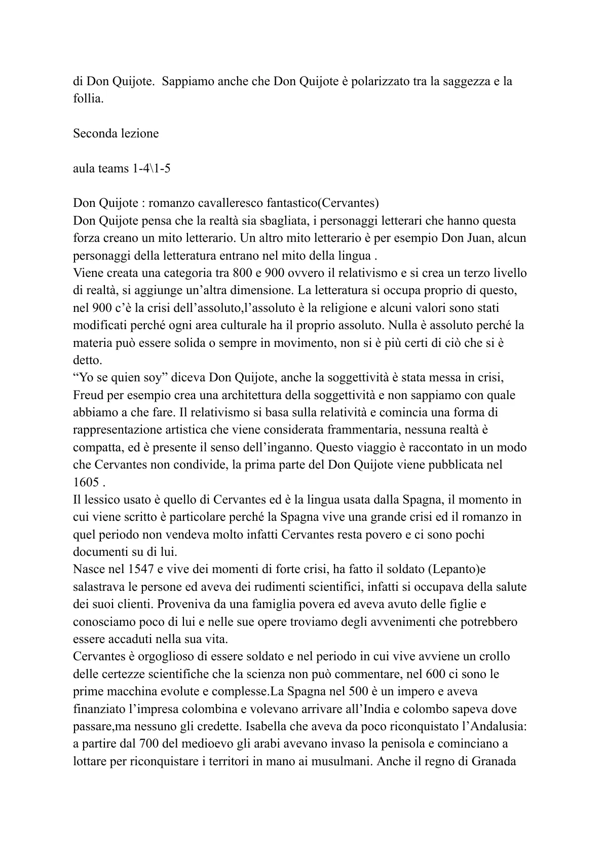 (vedi programma aula teams) Gli anni romani sono fondamentali per la sua formazione, perché nel palazzo di Giulia c'erano dei testi molto importanti. Era esposto alla letteratura umanistica e la cultura dominante era quella italiana, ma non può rimanere a lungo e, o diventava un uomo di lettere oppure si dedicava alle armi, erano queste le due strade che potevano consentire ad un giovane di famiglia non ricca di crearsi una vita. Esclude la carriera de las letras e come uomo rinascimentale diventa un soldato e resterà legato a questi suoi trascorsi. Va a combattere a Lepanto e rimane ferito in una battaglia navale e gli europei vanno contro le navi turchi e vincono, quel giorno lui era quasi delirante e aveva esposto la sua vita a questa battaglia e torna con gli onori. Subito dopo passa un periodo di crisi e mentre cerca da Napoli cerca di tornare in Spagna,ma durante ilviaggio di fronte la costa viene attaccato dai nemici e viene fatto prigioniero ed è condotto ai bagni di algeri, ovvero le galere. Nel mare avevano le navi prigioniere e i prigionieri venivano riscattati e lui resterà diversi anni in questa situazione in attesa che la famiglia raccogliesse i soldi per il riscatto. Questo fatto lo proietta nelle sue opere con altri personaggi. Era presente il problema del romanzo e questo problema sta con il mondo reale,con la fine del 400 e primo 500 c'è uno sviluppo della prosa narrativa in volgare e le forme della prosa narrativa era la prosa didattica, come le cronicas in quanto c'era il bisogno che le cronache storiche venivano registrate con l'idea storico documentaristica e lo scopo è la chiarezza. Questa prosa si perfeziona e nasce il romanzo di ficción e si comincia ad inventare a creare nuove realtà , dall'ozio si crea qualcosa. L'ambivalenza e l'ambiguità giovano alla scrittura di invenzione ed avviene questa doppia linea per usare la prosa, questo è importante perché un certo tipo di prosa narrativa prenderà spunto dalla vita vera . Ci sarà un'altra linea di creazione che invece gioca sul fantastico creando personaggi fantasiosi, si mostra quindi una possibilità di creazione e questa esperienza che Cervantes ha vissuto passa in diverse opere . Per esempio in una tragedia o nel Quijote , l'elemento vero e vitale di Cervantes diventa materia di narrazione; dopo 5 anni la famiglia raccoglie il denaro per riscattare lo scrittore e ciò avviene attraverso la mediazione dei padri trinitari. Per trattare con i mususlmani c'erano alcuni gruppi religiosi come i padri trinitari, ai quali danno i propri risparmi, Cervantes non sa ancora di che vivere e va a Madrid, ma sono dei momenti difficili e nasce la sua prima figlia da una donna che non sposa, ovvero Catalina de Salazar. La prima opera è la Galatea (1585) ed è la novela pastoril e in Spagna qualche scrittore had già utilizzato questo genere ed era la Diana : hanno una componente realistica perché si tratta del mondo dei pastori, ma c'è anche della fantasia. Il termine novela significa romanzo, poi si utilizzerà il termine cuento per rappresentare i racconti. Per indicare una narrazione non troppo lunga si utilizzano le novelas breves . La Galatea è un'opera che avrà successo ed è uno di quei testi che Cervantes cita nel Quijote, la Galatea rientra nei modelli del tempo e quindi è il suo tentativo di imporsi come narratore e autore di novelas e quella è la sua vocazione. Il romanzo pastorale ha elementi fantastici e il patto con il lettore è che l'autore racconta storie inverosimili e lui fa finta di crederci, ma c'è un altro versante più realistico.