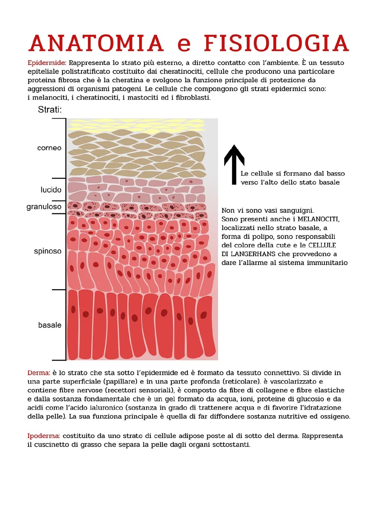 Epidermide: Rappresenta lo strato più esterno, a diretto contatto con l'ambiente. È un tessuto epiteliale polistratificato costituito dai cheratinociti, cellule che producono una particolare proteina fibrosa che è la cheratina e svolgono la funzione principale di protezione da aggressioni di organismi patogeni. Le cellule che compongono gli strati epidermici sono: i melanociti, i cheratinociti, i mastociti ed i fibroblasti.