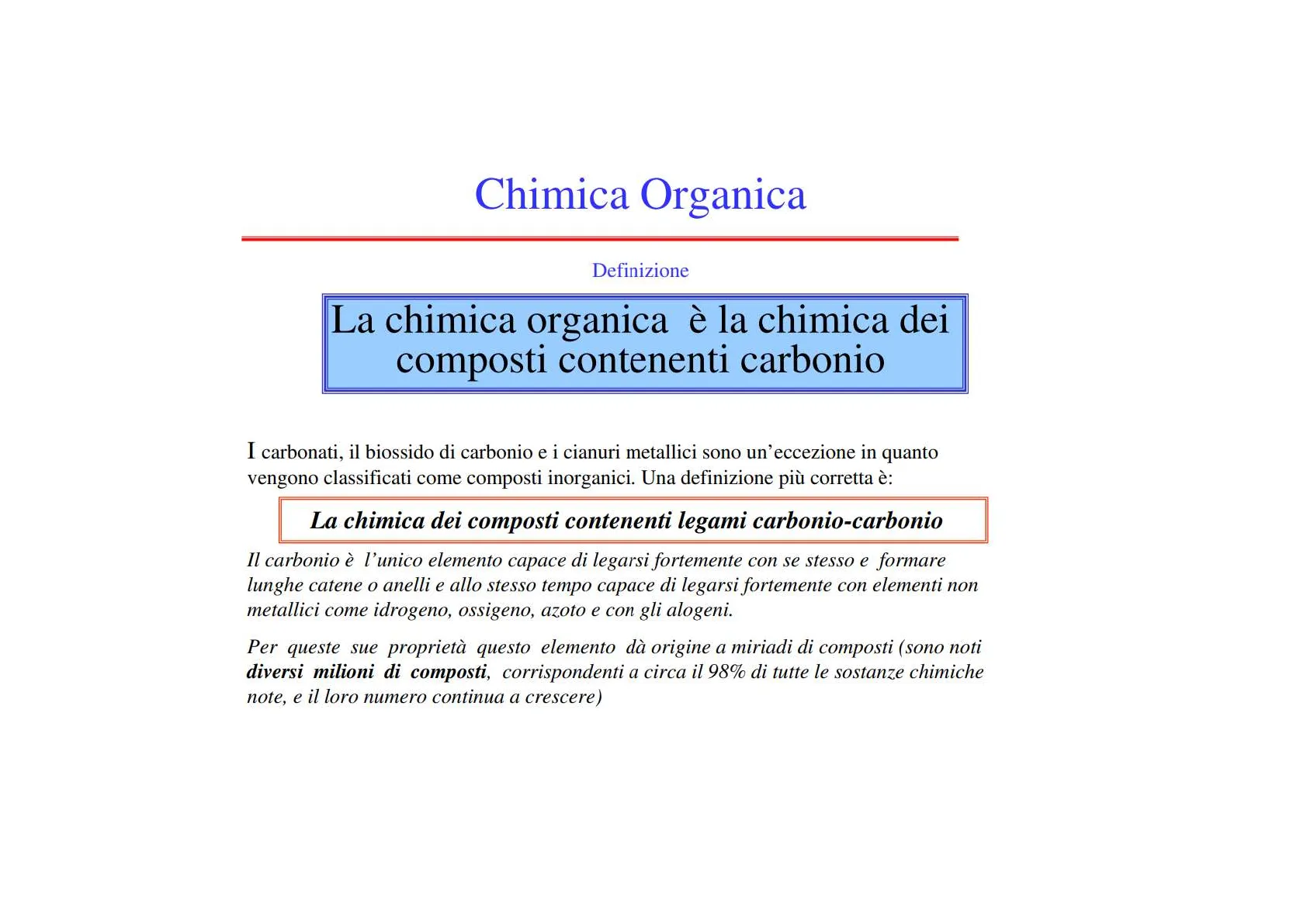 Definizione La chimica organica è la chimica dei composti contenenti carbonio I carbonati, il biossido di carbonio e i cianuri metallici sono un'eccezione in quanto vengono classificati come composti inorganici. Una definizione più corretta è: La chimica dei composti contenenti legami carbonio-carbonio Il carbonio è l'unico elemento capace di legarsi fortemente con se stesso e formare lunghe catene o anelli e allo stesso tempo capace di legarsi fortemente con elementi non metallici come idrogeno, ossigeno, azoto e con gli alogeni. Per queste sue proprietà questo elemento dà origine a miriadi di composti (sono noti diversi milioni di composti, corrispondenti a circa il 98% di tutte le sostanze chimiche note, e il loro numero continua a crescere)
