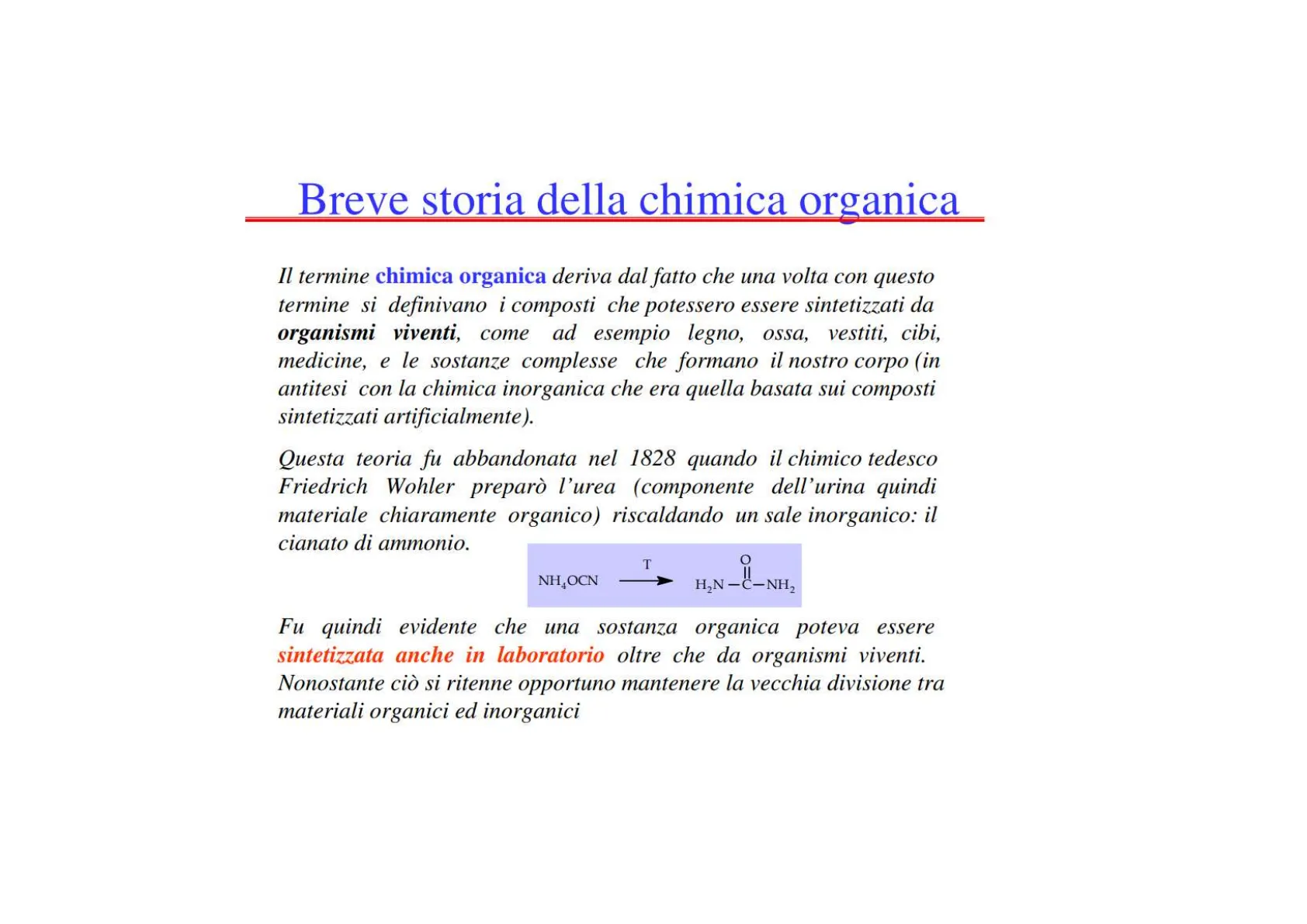 NH4OCN T H2N-C-NH2 O Fu quindi evidente che una sostanza organica poteva essere sintetizzata anche in laboratorio oltre che da organismi viventi. Nonostante ciò si ritenne opportuno mantenere la vecchia divisione tra materiali organici ed inorganici