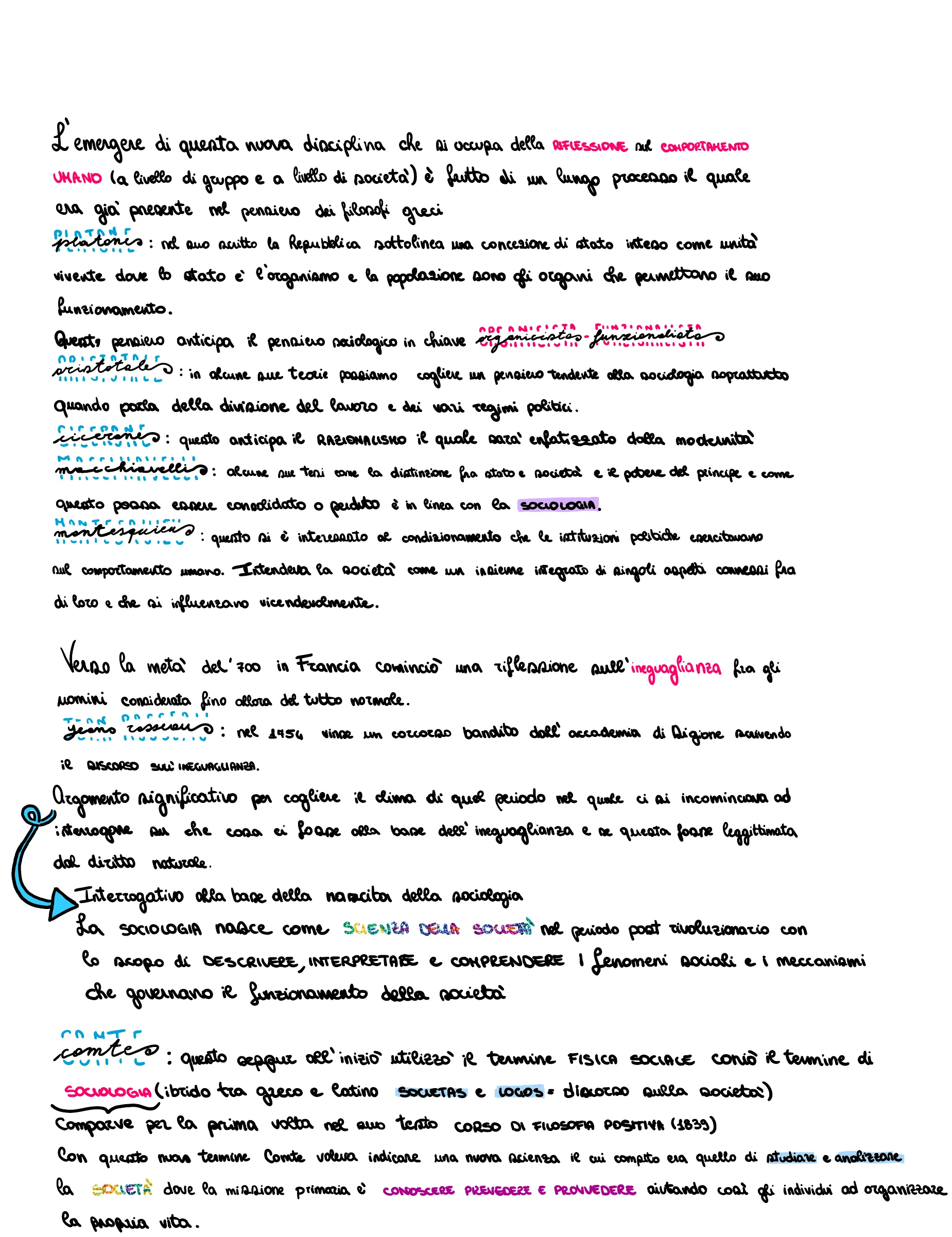 07/04/22 16:42 L'emergere di questa nuova disciplina che si occupa della RIFLESSIONE SUL COMPORTAMENTO UMANO (a livello di gruppo e a livello di società) è frutto di un lungo processo il quale era già' presente nel pensiero dei filozofi greci platones: nol ano scritto la Repubblica sottolinea una concezione di stato inteso come unità vivente dove lo stato è l'organismo e la popolazione sono gli organi che permettono il suo funzionamento. Quent, pensiero anticipa il pensiero sociologico in chiave organicistas- ADE ANICIATA FINTIANALISTA unzionalista mintotales : in alcune que teorie possiamo cogliere un pensiero tendente alla sociologia soprattutto THIS. VIHILL quando parla della divisione del lavoro e dei vari regimi politici. cicerone: questo anticipa il RAZIONALISMO il quale sarà enfatizato dalla modernità MAIRIE machiavelli: alcune sue tesi come la distinzione fra stato e società e il potere del principe e come quanto possa essere consolidato o perduto è in linea con la SOCIOLOGIA. montesquieno: questo si è interessato al condizionamento che le istituzioni politiche esercitavano sul comportamento umano. Intendeva la società come un insieme integrato di singoli aspetti connessi fra di loro e che si influenzano vicendevolmente. Verso la metà del'700 in Francia cominciò una riflessione sull'ineguaglianza fra gli uomini considerata fino allora del tutto normale. yesno rosseau: nel 1954 vince un corcorso bandito dell'accademia di Digione scrivendo il DISCORSO SUL INEGUAGLIANZA. argomento significativo per cogliere il clima di quel periodo nel quale ci ai incominciava ad interrogone Au che cosa ci fosse alla base dell'ineguaglianza e se questa forne legittimato del diritto naturale. Interrogativo alla base della narcita della sociologia La SOCIOLOGIA nasce come SCIENZA DELA SOCIETÀ nel periodo port rivoluzionario con lo scopo di DESCRIVERE, INTERPRETARE e COMPRENDERE I fenomeni sociali e I meccanismi che governano il funzionamento della società' SAMTr conteo: questo sepque all'inizio" utilizzo il termine FISICA SOCIALE coniò il termine di SOCIOLOGIA (ibrido tra greco e latino SOCIETAS e LOGIOS = discorso sulla società) Comparve per la prima volta nel ano tento CORSO DI FILOSOFIA POSITIVA (1839) Con questo nuon termine Conte voleva indicare una nuova scienza il cui compito era quello di studiare e analizare la SOCIETÀ' dove la missione primaria è' CONOSCERE PREVEDERE E PROVVEDERE aiutando così gli individui ad organizare la propria vita.