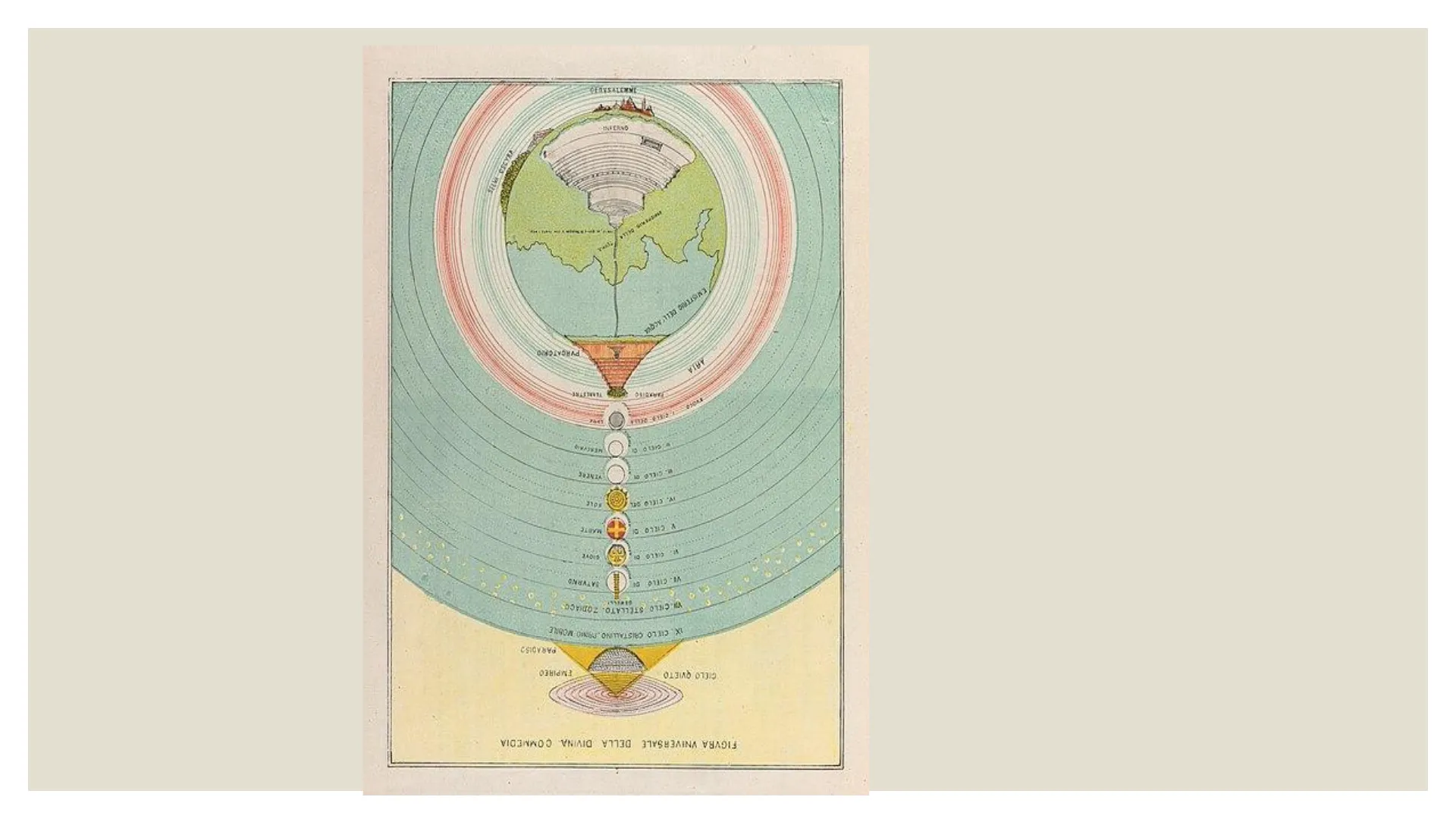 poi al paradiso. Il torso e la testa si collocano nell'emisfero del Nord, i piedi penzolano