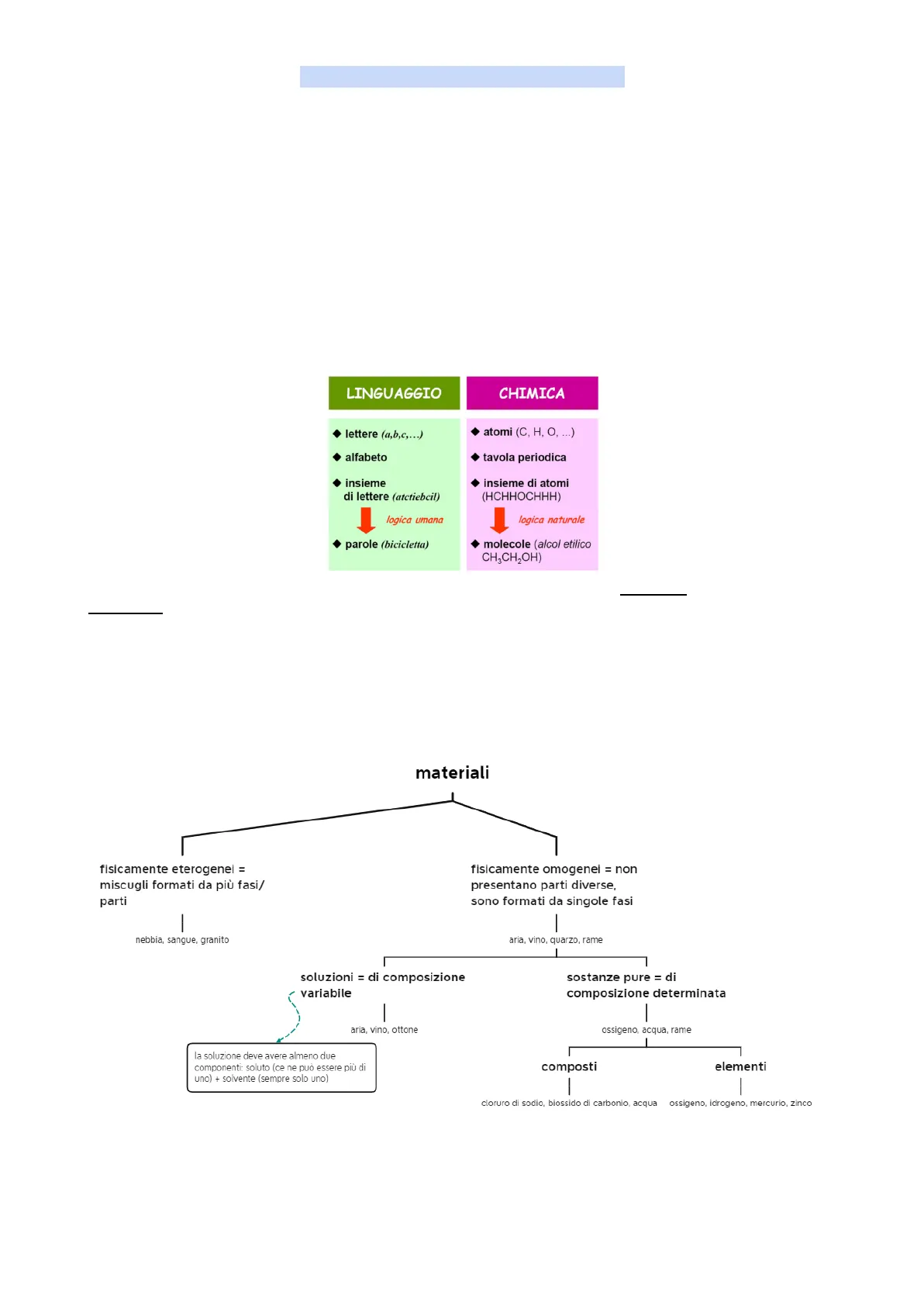 Milioni di sostanze pure sono nate -> pochissime di queste (un centinaio) sono sostanze elementari o elementi, tutti gli altri sono composti (a composizione costante). Ognuno di essi ha una precisa identità chimica e un nome. Un miscuglio o miscela è una porzione di materia comprendente più sostanze, e si dividono in: