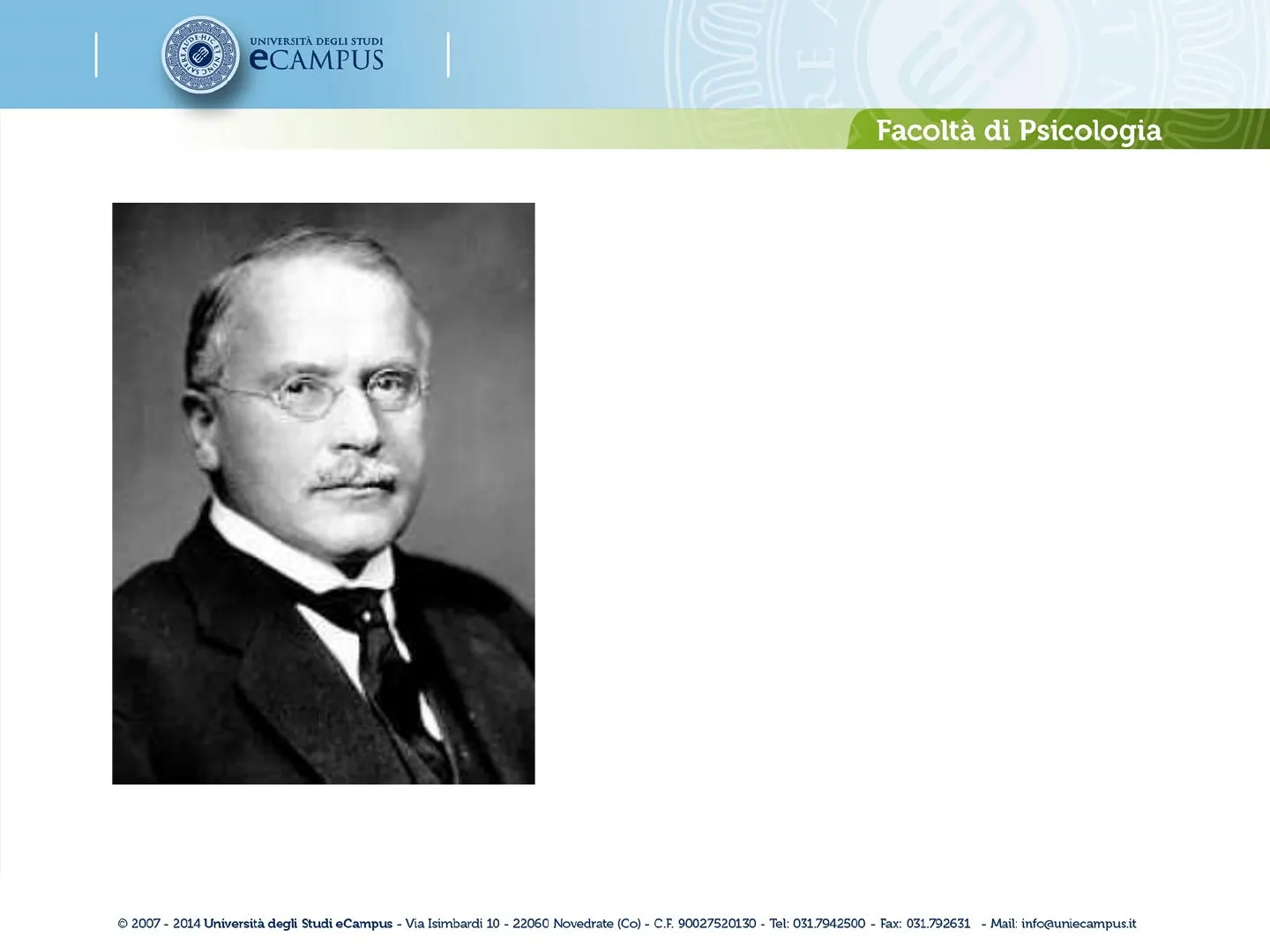 RE TN UNIVERSITÀ DEGLI STUDI eCAMPUS Corso di Laurea: Insegnamento: Lezione nº: Titolo: Attività nº: SCIENZE E TECNICHE PSICOLOGICHE (D.M. 270/04) PSICOLOGIA DINAMICA 20 Carl Gustav Jung (parte I) E 1 Facoltà di Psicologia Lezione nº 20 Carl Gustav Jung (parte I) Prof. Dario Cafagna c 2007 - 2014 Università degli Studi eCampus - Via Isimbardi 10 - 22060 Novedrate (Co) - C.F. 90027520130 - Tel: 031.7942500 - Fax: 031.792631 - Mail: info@uniecampus.it