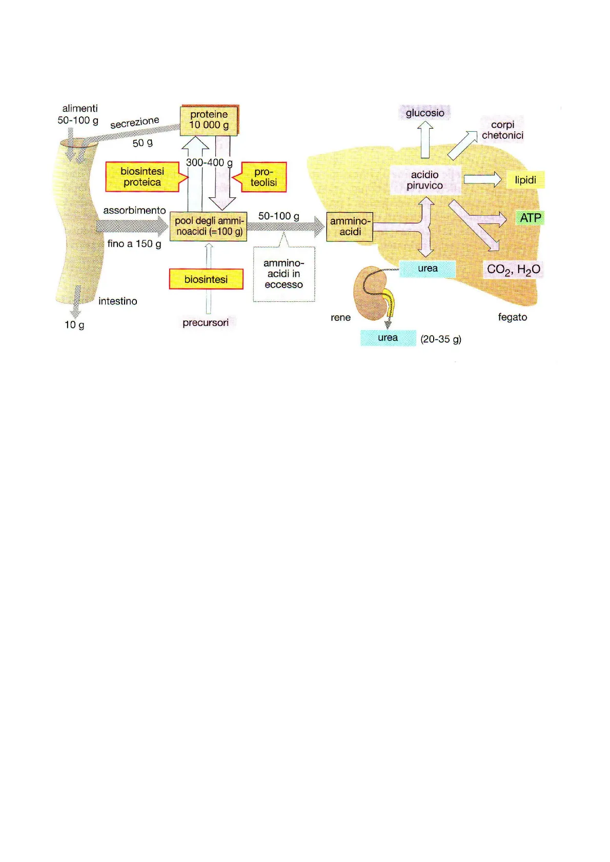 alimenti 50-100 g glucosio secrezione proteine 10 000 g corpi chetonici 50 g 300-400 g biosintesi proteica pro- teolisi acidio piruvico lipidi C ATP pool degli ammi- noacidi (=100 g) ammino- acidi fino a 150 g N biosintesi ammino- acidi in eccesso urea CO2, H2O intestino rene fegato 10 g precursori urea (20-35 g) assorbimento 50-100 g