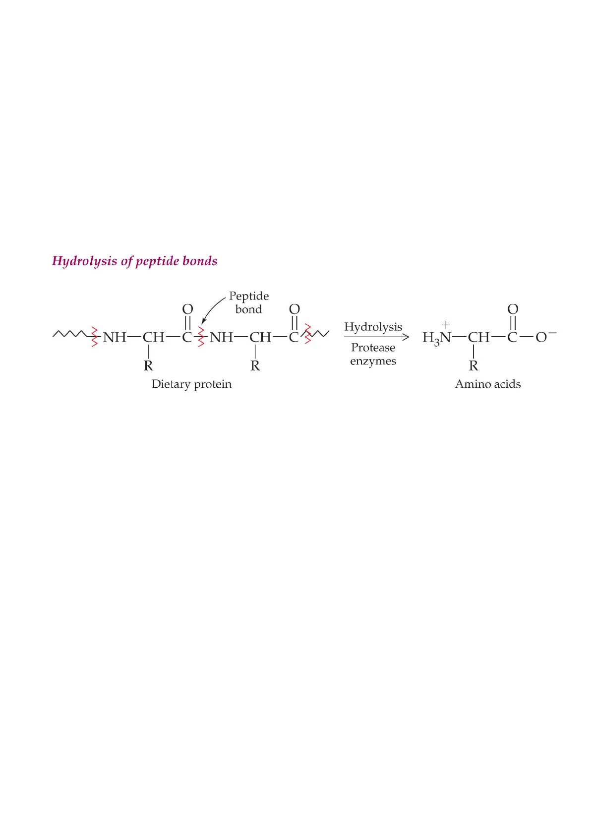 Hydrolysis of peptide bonds Peptide bond O o + A NH-CH-CNH-CH-C' - Protease enzymes 1 R R R Dietary protein Amino acids II Hydrolysis H3N-CH-C-O-