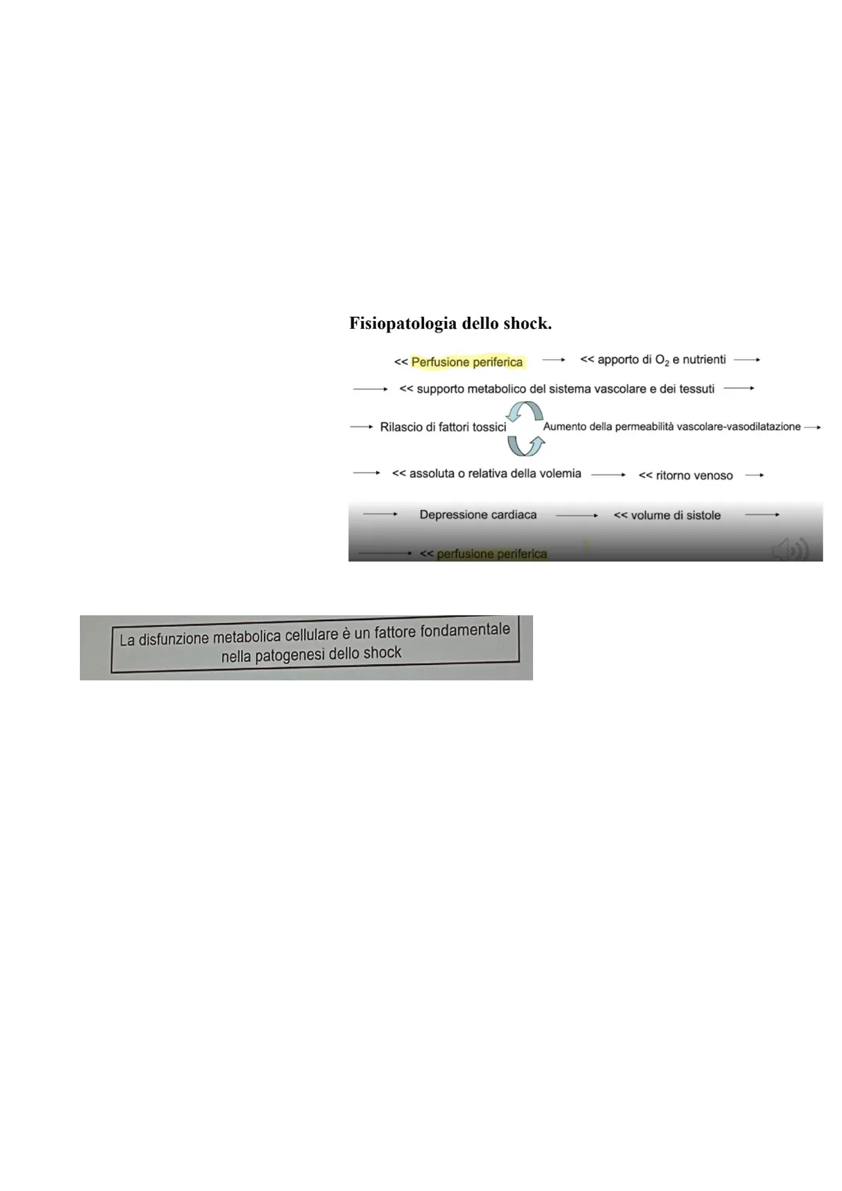 Come si manifesta l'alterazione del metabolismo cellulare? L'alterazione del metabolismo cellulare ( il prof ribadisce che è dovuta proprio al fatto che, a causa dell'ipoperfusione, c'è stagnazione dei tessuti periferici, c'è ridotta disponibilità di substrati metabolici e accumulo di fattori tossici, che vedremo più avanti) si concretizza (a sinistra e a destra nel diagramma) con la minore capacità delle cellule di sfruttare quel poco di ossigeno ancora disponibile (l'ossigeno scarseggia a causa dell'ipoperfusione dei tessuti e a causa dell'accumulo di fattori tossici che alterano la capacità dei tessuti di sfruttare l'ossigeno disponibile) > vi è quindi riduzione delle sintesi energetiche ossigeno-dipendenti (cioè la fosforilazione ossidativa) e vi è anche la riduzione della capacità cellulare di sfruttare vie alternative alla fosforilazione ossidativa, che possono essere basate sull'uso intenso della glicolisi anaerobia).