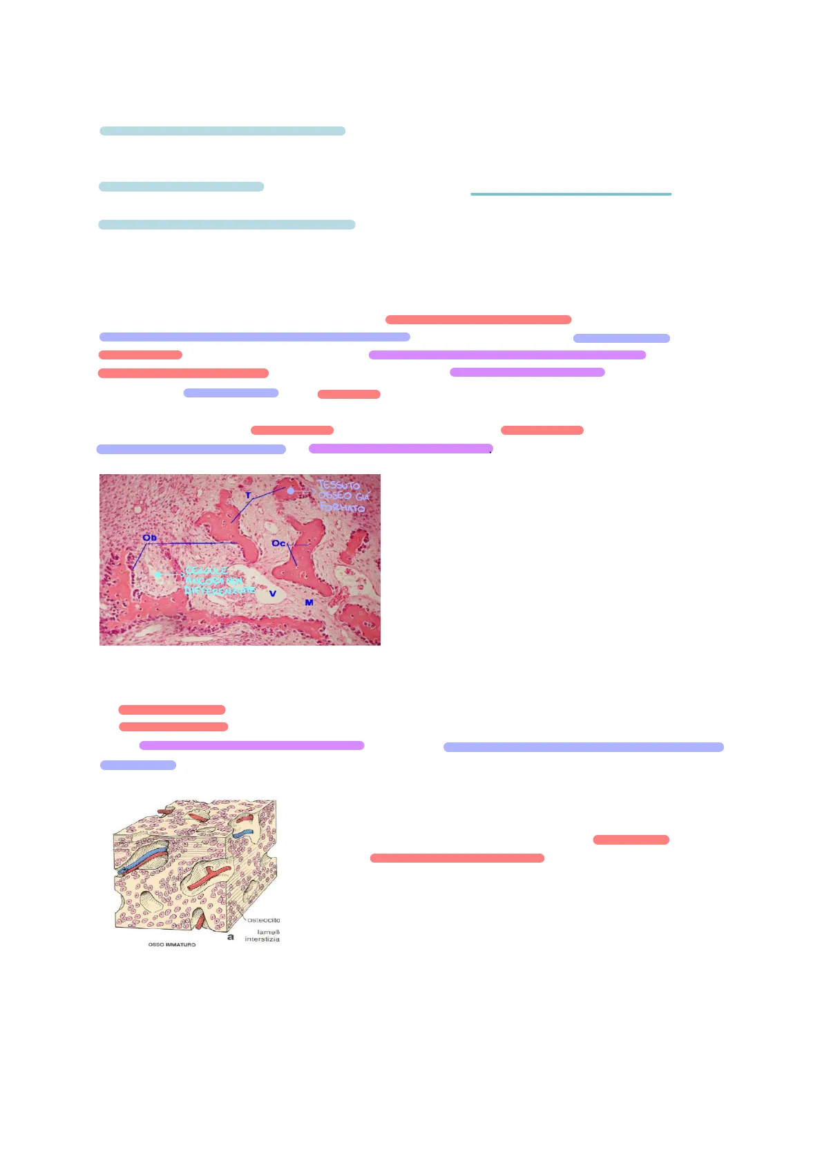 TESSUTO BEOSSEO GIÁ FORMATO Őb CELLULE ANCORA NON DIFFEREN21ATE V M Nella foto: parte rosa chiaro sono le cellule che ancora si devono differenziare, mentre invece la parte rosa scuro (T) è l'area in cui il tessuto osseo si è già formato, quando le cellule rimangono intrappolate dentro trabecole e diventano osteociti.