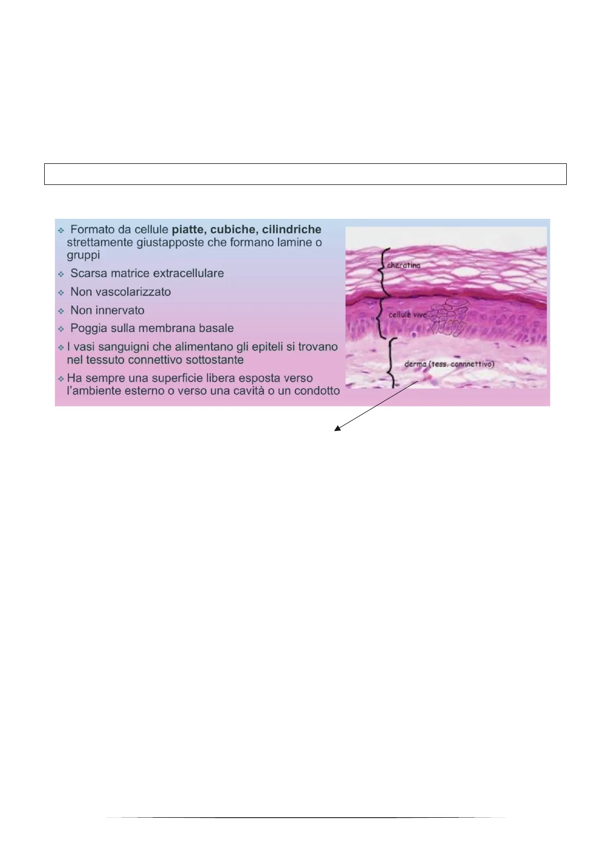Questo preparato istologico è colorato attraverso il metodo ematossilina-eosina, grazie al quale possiamo individuare i nuclei cellulari (colorati di lilla scuro). Nell'immagine sono cerchiate le cellule dell'epidermide, esse, come tutte le cellule epiteliali, appaiono addossate tra di loro e in questo caso formano più strati. Notiamo invece che nel derma, che è un tessuto connettivo, i nuclei sono molto più distanti tra di loro e sono circondati da matrice extracellulare formata da fibre proteiche di varia natura (appare di un rosa molto chiaro poiché l'ematossilina-eosina non è in grado di evidenziare le proteine, a tale fine bisognerebbe utilizzare la colorazione tricromica). Nei tessuti epiteliali tale matrice non è presente, così come le innervazioni e i vasi sanguigni, perciò tutti gli scambi nutritivi avvengono passivamente per diffusione dal tessuto connettivale sottostante. Ciò non toglie che le cellule epiteliali devono comunicare tra di loro e lo fanno grazie alle giunzioni. Osservando l'epidermide possiamo notare che c'è una sorta di polarizzazione tra gli strati. Quando abbiamo a che fare con un multistrato, bisogna distinguere tra lo strato apicale (quello esposto verso l'esterno o verso una cavità) e lo strato basale (cioè quello inferiore che interagisce con la membrana basale). Ad esempio nel caso di una ghiandola lo strato basale è formato dalle cellule più distanti dal lume della ghiandola. Nel caso dell'epidermide, lo strato basale è la sede della nicchia delle cellule staminali, infatti mano a mano che si differenziano si spostano verso l'esterno fino a morire e formare i cheratinociti. Un'altra caratteristica comune a tutte le cellule epiteliali dello strato basale, o comunque dell'unico strato nel caso di un epitelio monostratificato, è che non poggiano direttamente sul tessuto connettivo, ma su una rete di proteine che servono a dare sostegno.