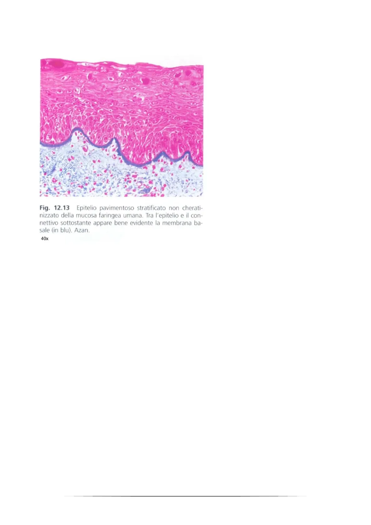 1Fig. 12.13 Epitelio pavimentoso stratificato non cherati- nizzato della mucosa faringea umana. Tra l'epitelio e il con- nettivo sottostante appare bene evidente la membrana ba- sale (in blu). Azan. 40x Utilizzando la colorazione tricromica tutto ciò che è proteico è evidenziato di blu. L'epitelio si deve infatti ancorare ad una matrice molto densa di proteine, essa è chiamata membrana basale (o erroneamente lamina basale). Esistono patologie in cui le proteine che la compongono sono mutate, di conseguenza non sono in grado di fornire sostegno. In questi casi l'epidermide si sfalda, letteralmente, causando l'esposizione del derma ed un alto rischio di infezione. La membrana basale ha un ruolo fondamentale anche nella formazione del carcinoma, cioè del tumore di origine epiteliale. Quando è insito nell'epitelio, la membrana basale funge da barriera che impedisce al tumore di accedere al tessuto connettivale e ai vasi sanguigni, causando metastasizzazione. L'ancoraggio tra le cellule basali e la membrana basale è utile anche per interagire con l'ambiente circostante, infatti alcune proteine funzionano da trasduttori di segnali, sono in grado di innescare cascate di fosforilazioni che inducono trascrizioni di fattori proliferativi (es le integrine funzionano proprio da meccano-trasduttori dei segnali, sono infatti marcatori tumorali perché nel tumore la loro trascrizione viene regolata, e sono induttori delle vie mitotiche). Le giunzioni hanno una distribuzione specifica, non sono disposte lungo i margini cellulari a caso.