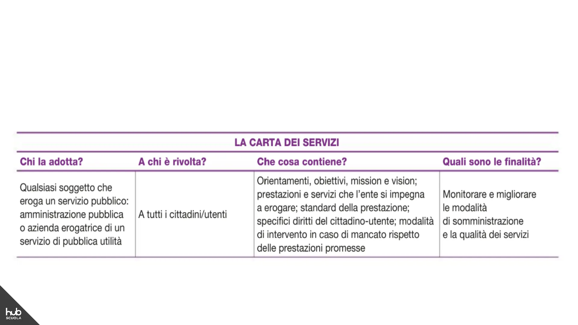 Orientamenti, obiettivi, mission e vision; prestazioni e servizi che l'ente si impegna a erogare; standard della prestazione; specifici diritti del cittadino-utente; modalità di intervento in caso di mancato rispetto delle prestazioni promesse