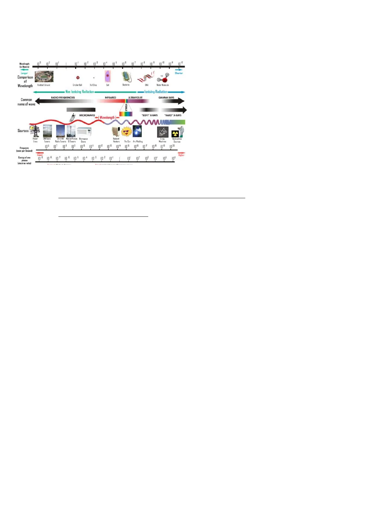 Lo spettro elettromagnetico ha radiazioni caratterizzate da lunghezze d'onda e frequenze. Queste due grandezze sono inversamente correlate, all'aumentare della frequenza si accompagna una riduzione della lunghezza d'onda e viceversa. Per lunghezze d'onda sempre maggiori, l'energia portata dall'onda sarà minore. Invece, nel caso di lunghezze d'onda minori, l'energia delle radiazioni sarà maggiore. Più la radiazione ha una lunghezza d'onda piccola (e frequenza elevata), più interagirà con oggetti piccoli. Dal visibile all'ultravioletto e fino a raggi x e y si interagirà con oggetti sempre più microscopici fino a evidenziare le macromolecole. Con radiazioni ancora più intense, sarà possibile agire sui legami chimici delle molecole e sui nuclei degli atomi. L'interazione tra materia e onda elettromagnetica valuta i quanti di energia che agiscono sugli elettroni nei nuclei, ogni elettrone è in grado di assorbire un determinato livello di energia (energia quantizzata) a una particolare frequenza e lunghezza d'onda. Acquisendo questa energia, l'elettrone si trova in uno stato eccitato e, tornando al suo stato energetico fondamentale, emette una radiazione con una frequenza minore e una lunghezza d'onda maggiore rispetto a quella assorbita. Le onde radio hanno lunghezze d'onda così alte da non consentire di misurare molecole biologiche, mentre le microonde e gli infrarossi sono utilizzati in ambito fisico e, invece, il visibile e l'ultravioletto in biochimica clinica. Esistono anche raggi x e y che interagiscono con i nuclei atomici. Ad esempio, con i raggi x nell'imaging si osservano porzioni solide dell'organismo.