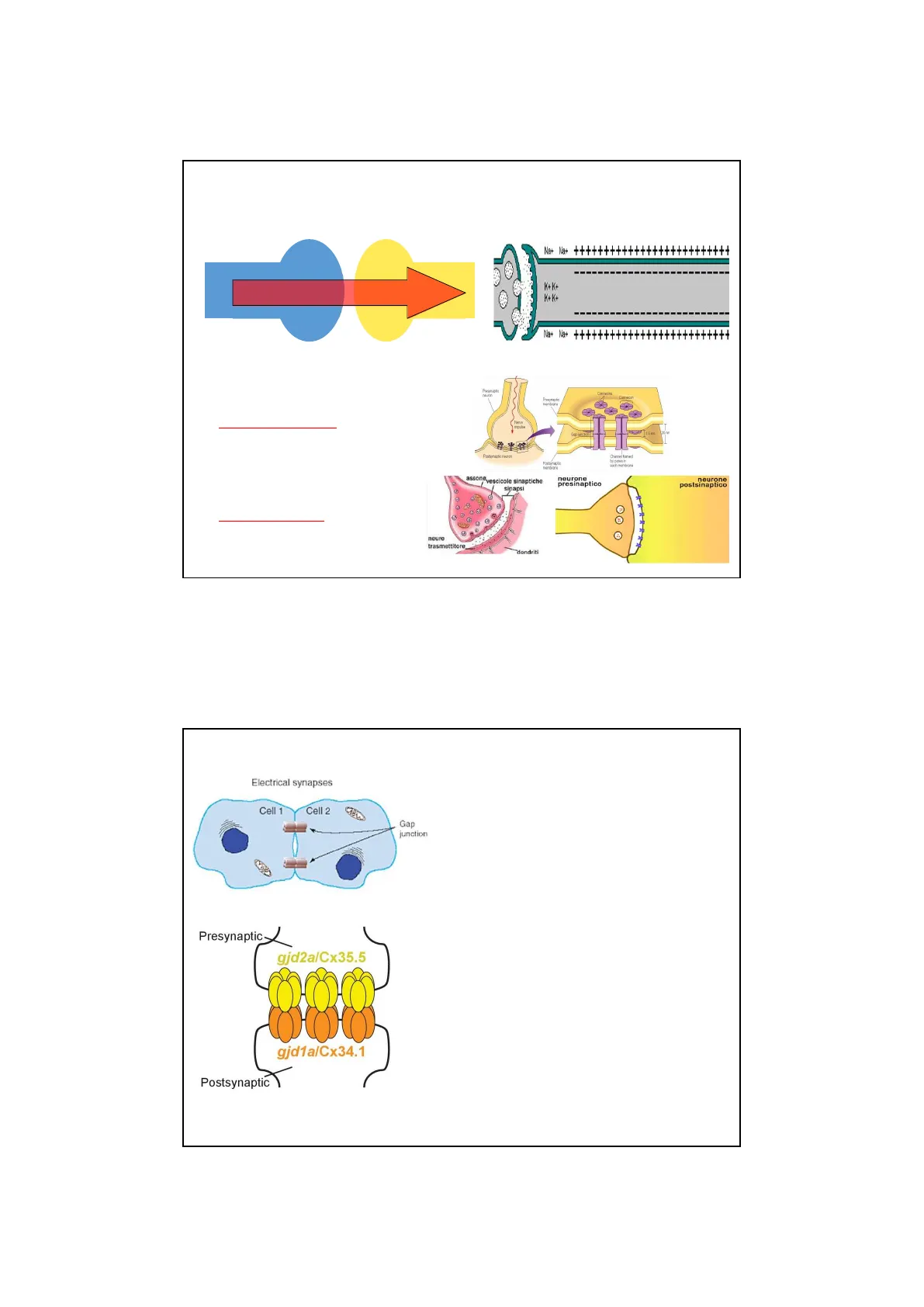 Electrical synapses Cell 1 Cell 2 Gap junction " Le membrane di cellule adiacenti sono collegate mediante giunzioni comunicanti (gap junctions). " I canali di connessione tra cellule adiacenti sono costituiti da coppie congiunte di emicanali detti connessoni, ognuno composto da 6 connessine disposte a cerchio intorno ad un asse centrale lungo il quale decorre il poro del canale Presynaptic- gjd2a/Cx35.5 gjd1a/Cx34.1 Postsynaptic " Le connessine possono ruotare in senso orario, modificando il lume del canale e quindi il suo grado di apertura. • Abbassamento del pH o incremento della concentrazione intracellulare di Ca2+ in una delle due cellule >modifica del canale. • I canali sono abbastanza ampi (circa 15 Å) da consentire il passaggio di tutti gli ioni inorganici. 4 • Spinapsi elettriche (giunzioni gap) - passano stimoli elettrici Postsynaptic08/05/2023
