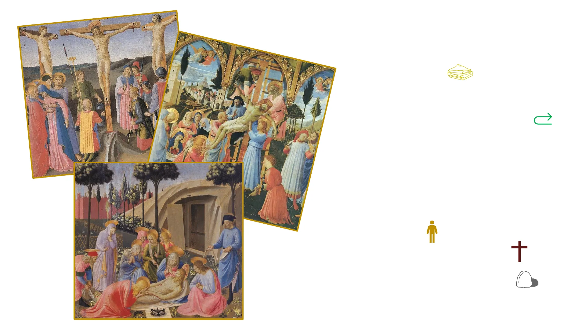 «Pilato, volendo dare soddisfazione alla folla, rimise in libertà per loro Barabba e, dopo aver fatto flagellare Gesù, lo consegno perché fosse crocifisso. [ ... ] Lo vestirono di porpora, intrecciarono una corona di spine e gliela misero attorno al capo. [ ... ] Dopo essersi fatto beffe di lui, lo spogliarono della porpora e gli fecero indossare le sue vesti, poi lo condussero fuori per crocifiggerlo». (Mc 15,15-20) Egli allora [Giuseppe d'Arimatea], comprato un lenzuolo, lo depose dalla croce, lo avvolse con il lenzuolo e lo mise in un sepolcro scavato nella roccia. Poi fece rotolare una pietra all'entrata del sepolcro». (Mc 15,46)