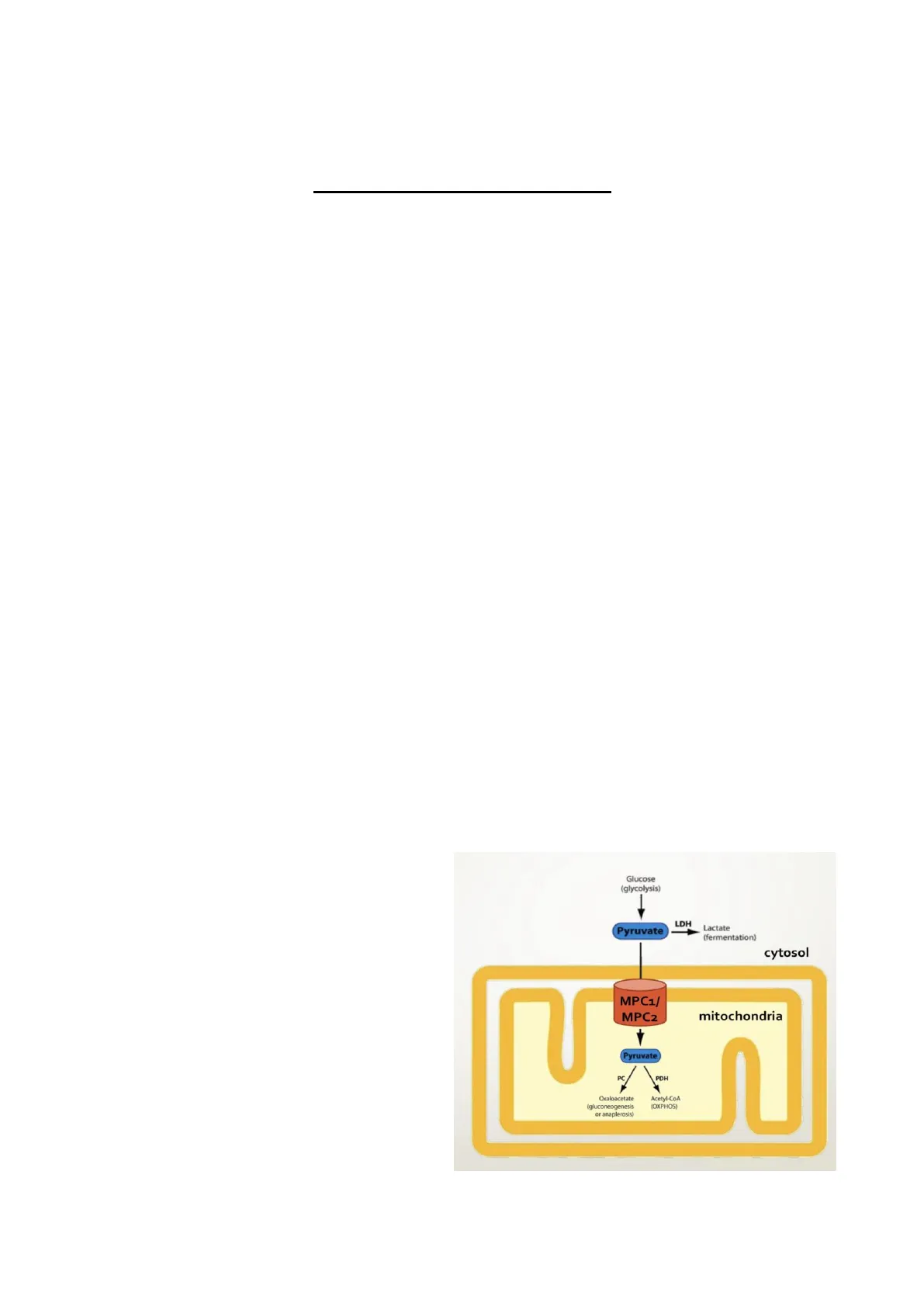 Innanzitutto, con la glicolisi e la fermentazione lattica noi siamo localizzati nel citoplasma, quindi gli enzimi di queste vie sono a livello del citosol; invece, le reazioni riguardanti l'ossidazione del piruvato avvengono nella matrice mitocondriale; quindi il piruvato, accumulato nella glicolisi, deve entrare nel mitocondrio. Per quanto riguarda le membrane mitocondriali, possiamo dire che i mitocondri presentano una doppia membrana: una interna ed una esterna. Di fatto, le molecole che possono superare la prima Glucose (glycolysis) - membrana, sono molecole che possono raggiungere un certo peso molecolare (comunque Pyruvate LDH Lactate (fermentation) - piccole molecole, ma non così piccole); si tenga, cytosol inoltre, presente che la membrana mitocondriale esterna possiede una serie di trasportatori che, MPC1/ MPC2 mitochondria come per le porine, aiutano il trasporto dei Pyruvate metaboliti dal lato più concentrato verso quello PDH meno concentrato. Va da sé che il piruvato Oxaloacetate (gluconeogenesis or anaplerosis) Acetyl-CoA (OXPHOS) accumulato nel citosol può attraversare la prima membrana senza bisogno di proteine, essendo 1minore di 10 kDalton; la seconda membrana è estremamente selettiva: possono passare acqua, anidride carbonica e ossigeno, ma non le altre molecole.