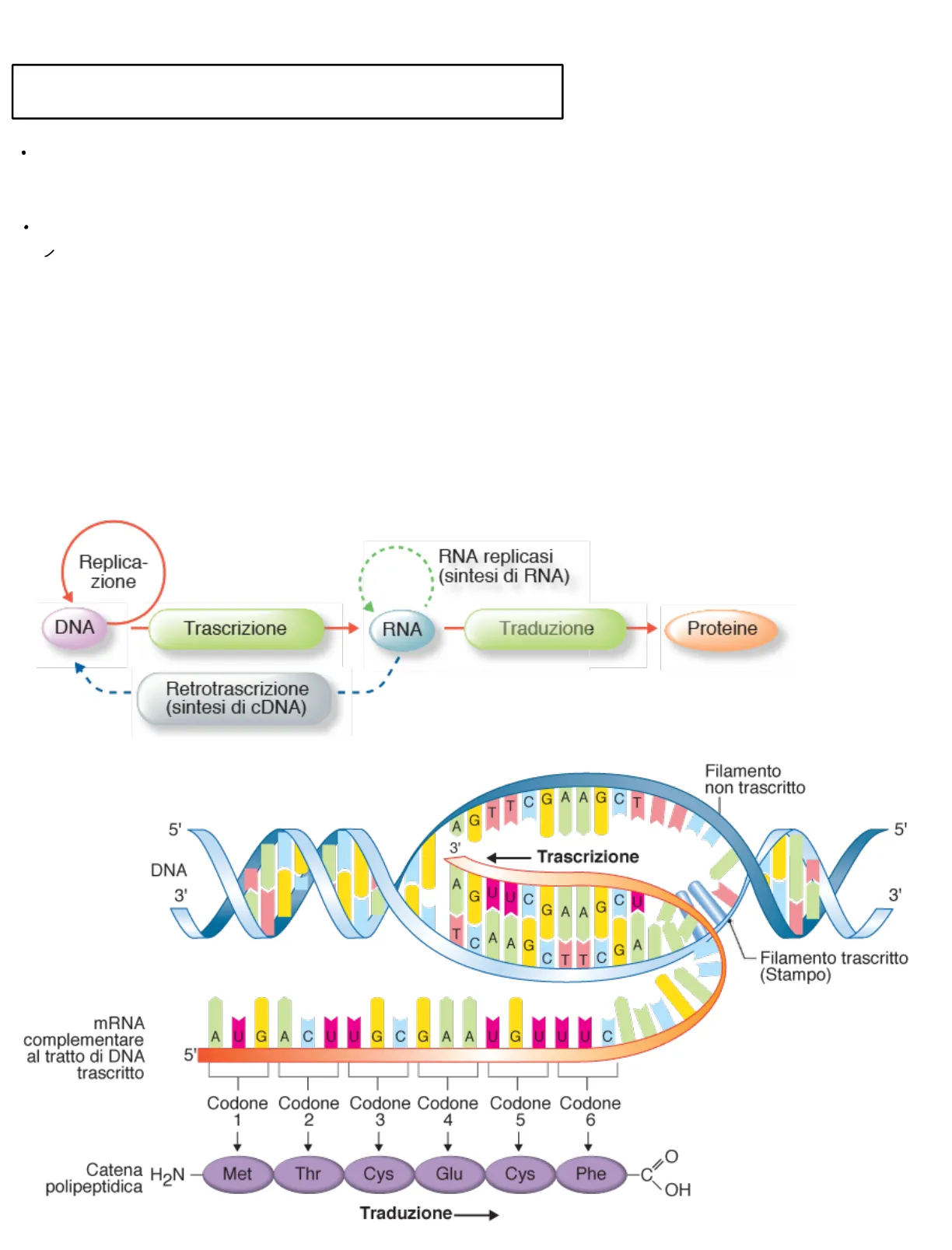 Replica- zione RNA replicasi (sintesi di RNA) DNA Trascrizione RNA Traduzione Proteine Retrotrascrizione (sintesi di cDNA) Filamento non trascritto 5' 5' 3' Trascrizione DNA 3' A U U C C U G A A T A C AG A Filamento trascritto (Stampo) mRNA complementare al tratto di DNA trascritto A GA c U UG CGAA U G U C 5' Codone Codone Codone Codone Codone Codone 1 2 3 4 5 6 - 1 1 1 Catena H2N polipeptidica Met Thr Cys Glu Cys Phe C =0 OH Traduzione T C GCT T G A 3 G G CT T C GALESSIA LANCIANI