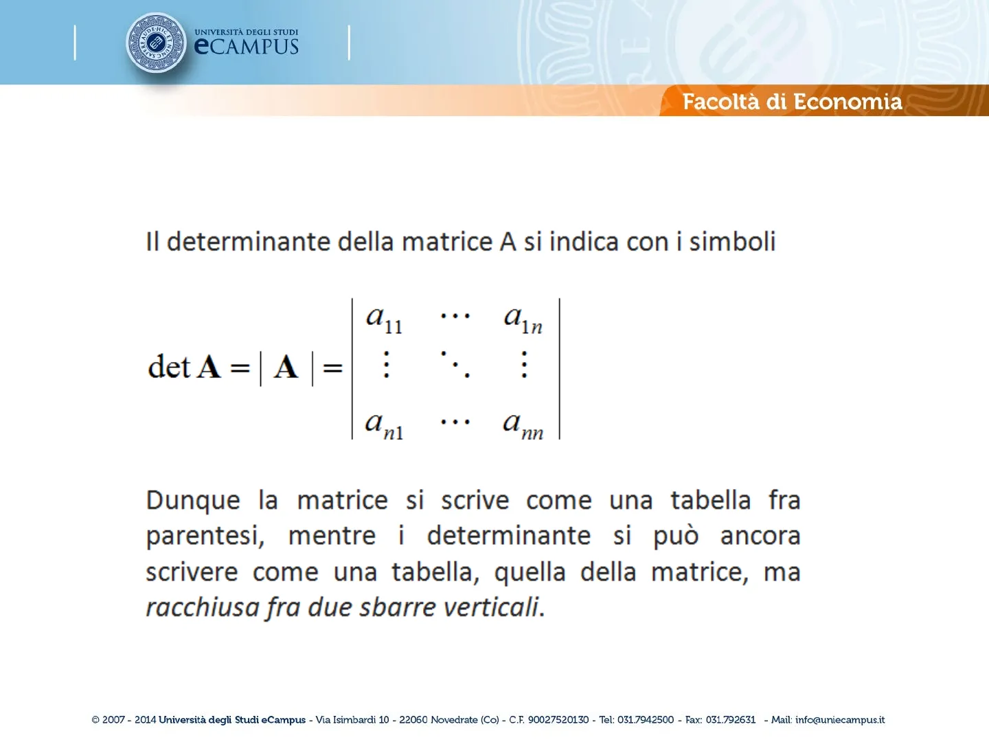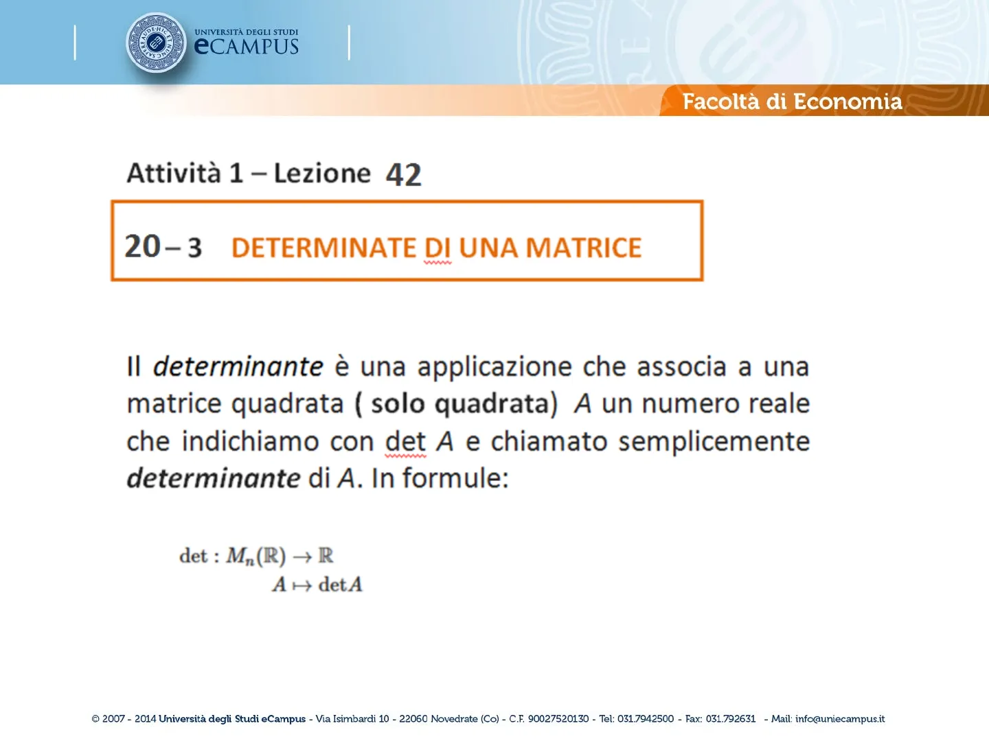 R.E. UNIVERSITÀ DEGLI STUDI eCAMPUS Corso di Laurea: Insegnamento: Lezione nº: Titolo: Attività nº: ECONOMIA - CURR. SCIENZE BANCARIE ED ASSICURATIVE (D.M. 270/04) METODI MATEMATICI 42 DETERMINANTE DELLA MATRICE 1 Facoltà di Economia