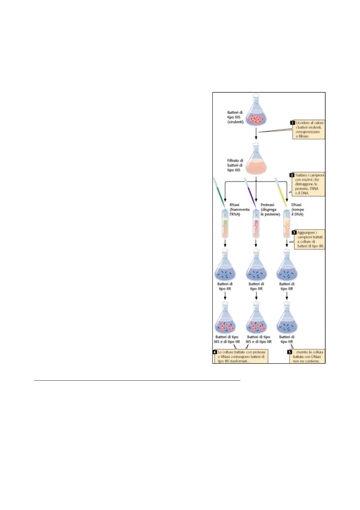 Batteri di tipo IIIS (virulenti) Uccidere al calore i batteri virulenti, omogeneizzare e filtrare Filtrato di batteri di tipo IIIS 2 Trattare i campioni con enzimi che distruggono le proteine, I'RNA o il DNA. RNasi (frammenta I'RNA) Proteasi (disgrega le proteine) DNasi (rompe il DNA) 3 Aggiungere i campioni trattati a colture di batteri di tipo IIR Batteri di tipo IIR Batteri di tipo IIR Batteri di tipo IIR Batteri di tipo IIIS e di tipo IIR Batteri di tipo IIIS e di tipo IIR Batteri di tipo IIR 4 Le colture trattate con proteasi o RNasi contengono batteri di tipo IIIS trasformati ... 5 ... mentre la coltura trattata con DNasi non ne contiene.